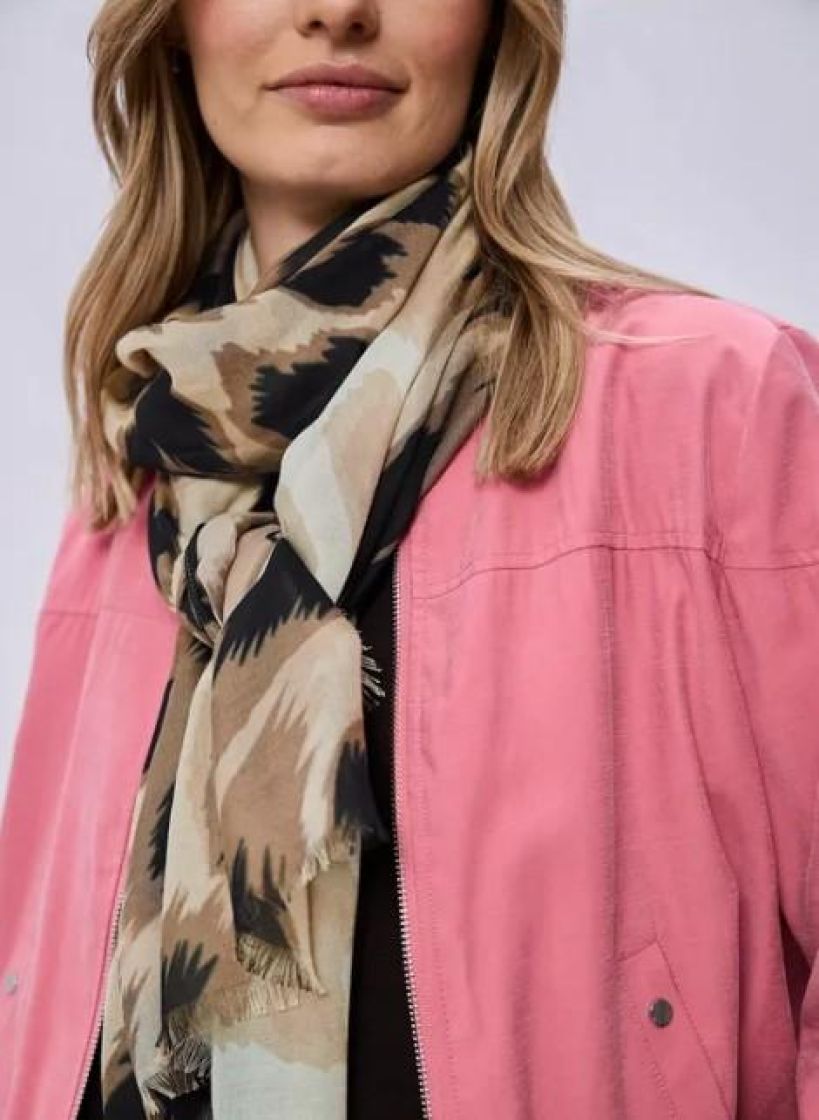 Street One makee leo kuviollinen huivi. Materiaali pehmeää ja ohutta modaalia. Huivissa on tekstiä ja reunat kivasti hapsutettu. Huivi sopii hyvin sisä- ja ulkokäyttöön.