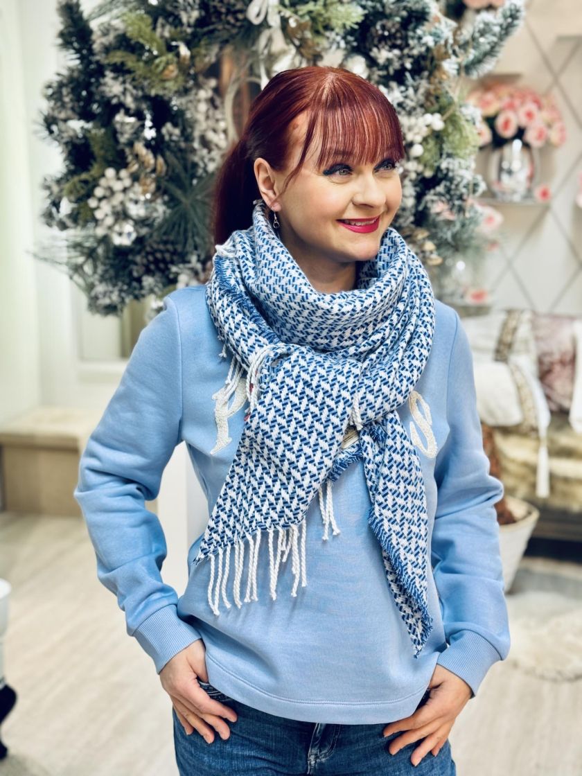 Street One kolmiohuivi makealla kuvioinnilla. Kuvion seassa kimaltaa kivasti metallilanka. Materiaali on todella pehmeää ja mukavan tuntuista. Yhdellä sivulla on reilut hapsut ja toinen sivu on kevyesti hapsutettu.