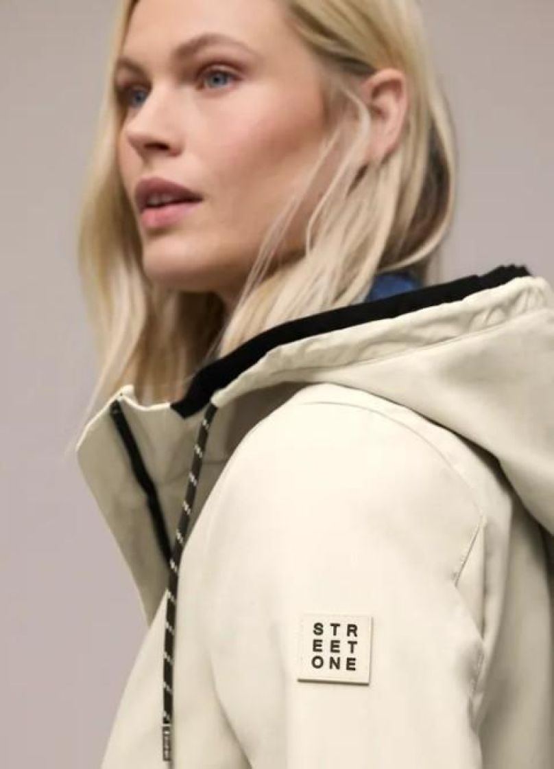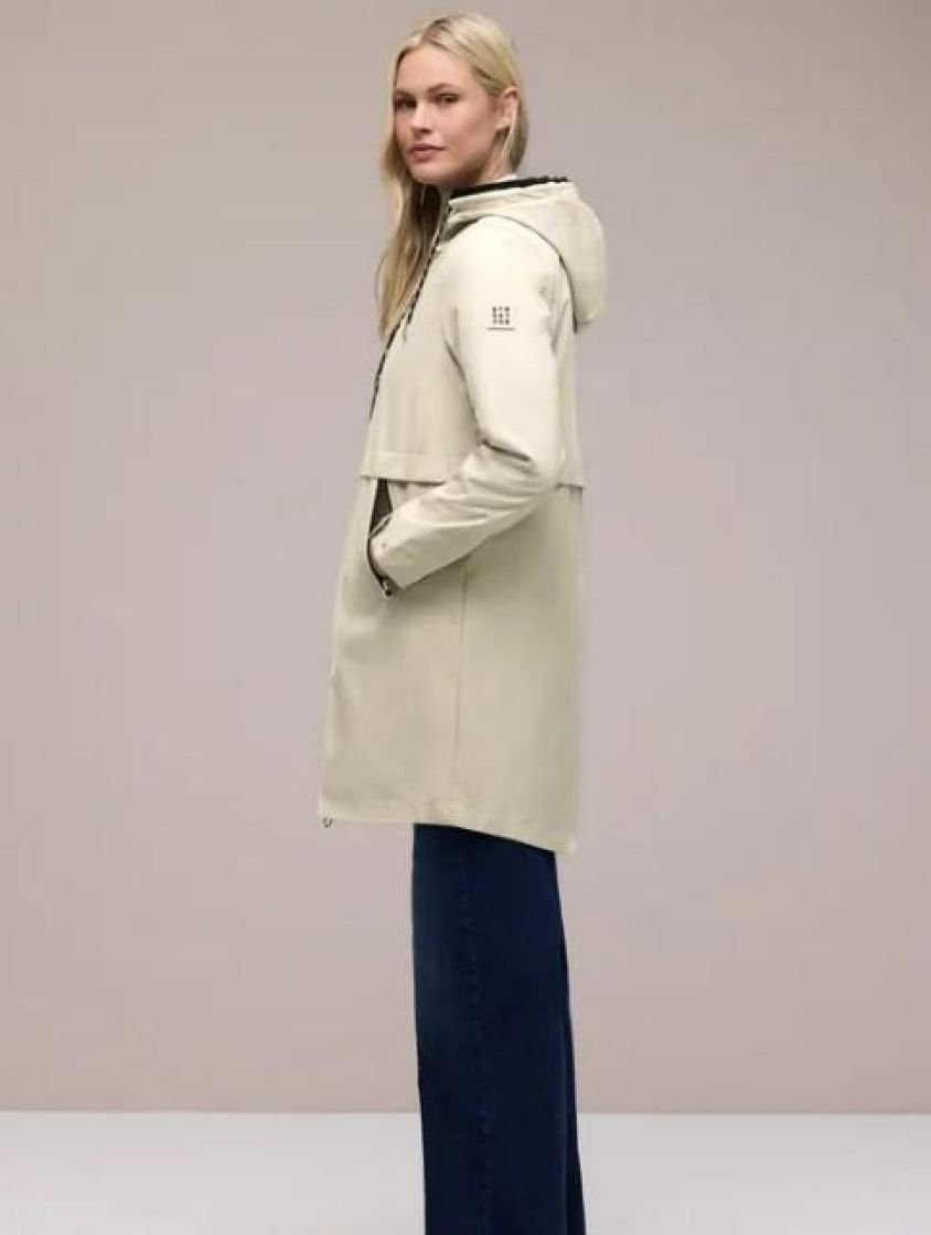 Täydellinen ulkoilutakki arkeen. Street One tyylikäs puolipitkä parkatakki. Materiaali on valmistettu mukavasta puuvillasekoitteesta. Sivuilla vetoketjutaskut ja hupussa kiristysnyörit. Helma on hieman pyöristetty. Takissa on vettähylkivä pinta. Normaali mitoitus.