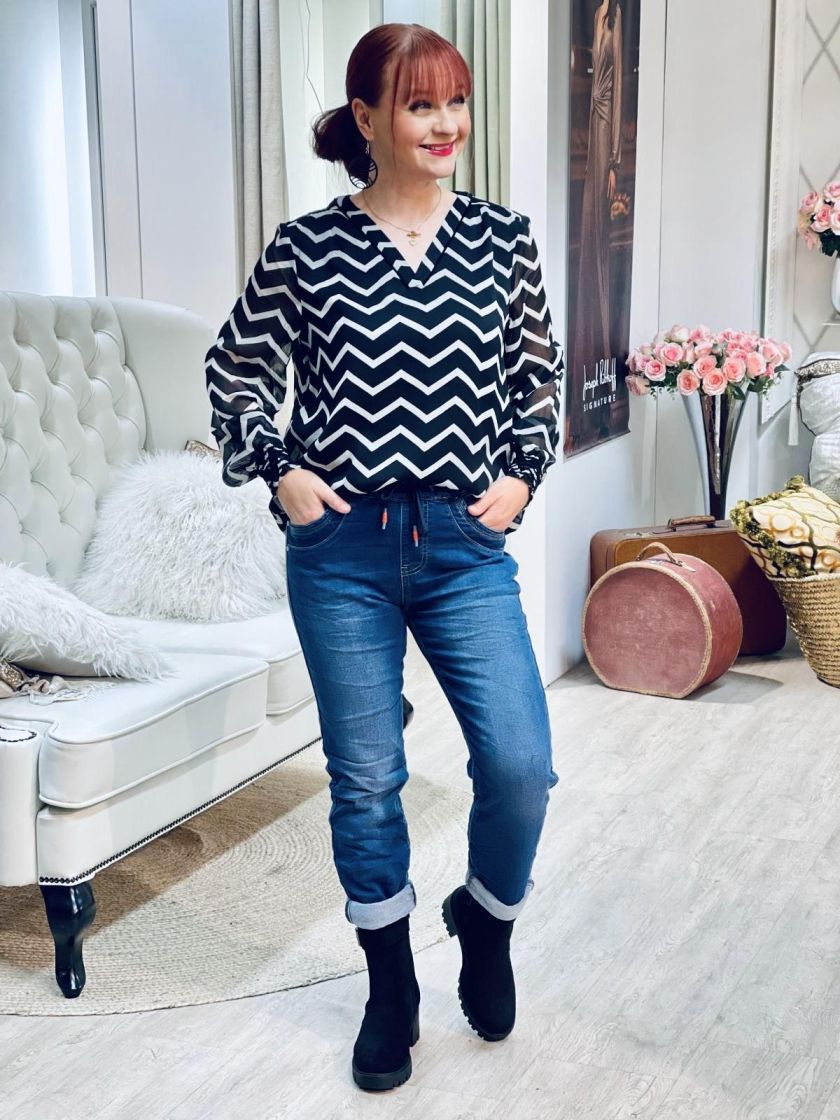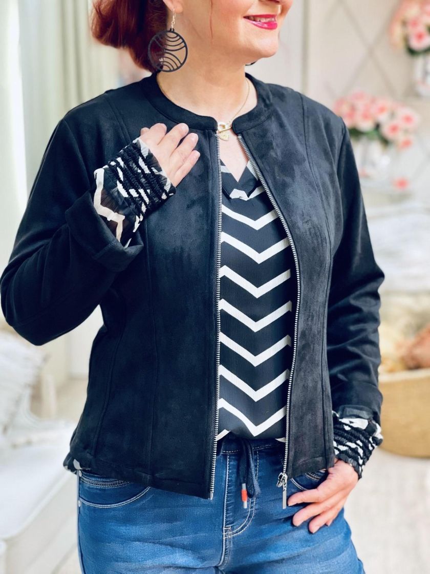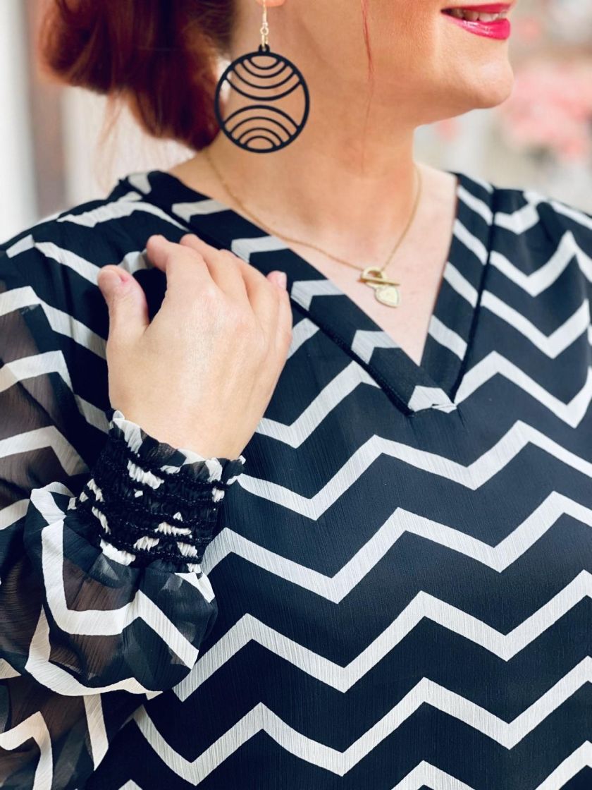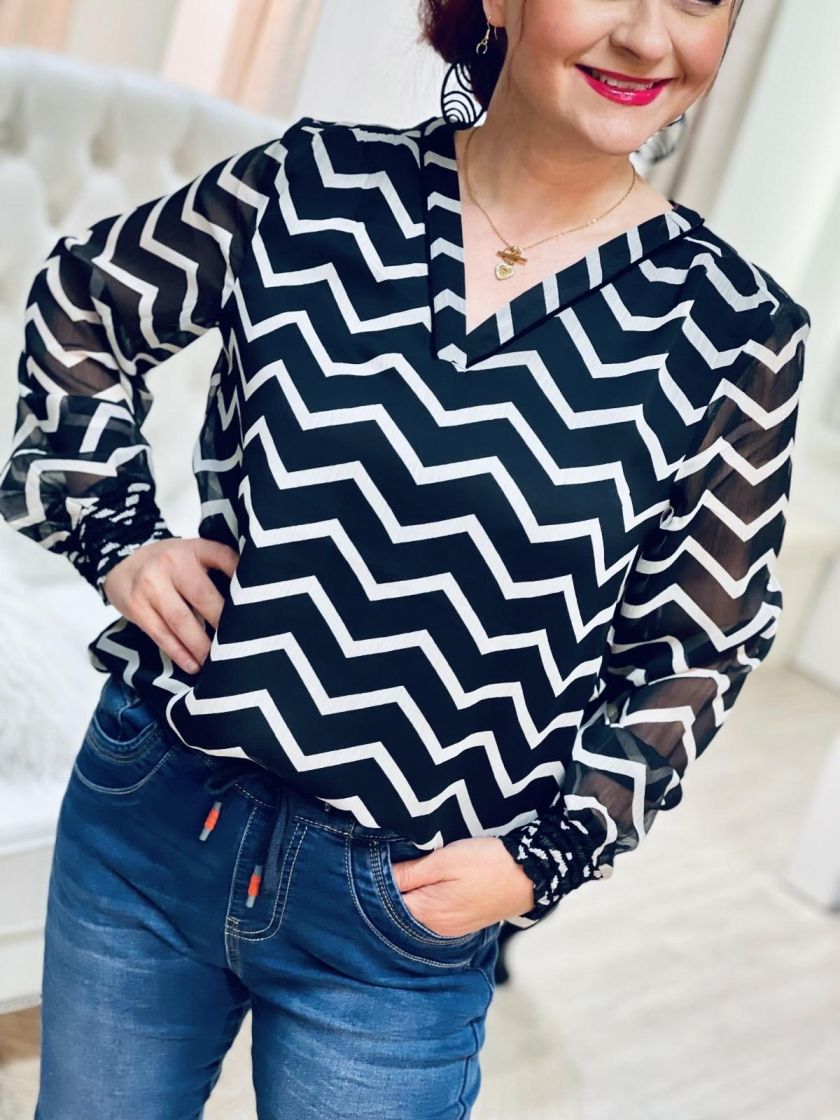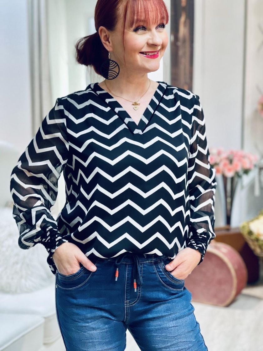 Street One sifonkipusero makealla siksakkuosilla. Hiha on kivasti läpikuultava ja hihansuussa ryhtiä tuo samettinauhalla koristeltu resori. Pääntien kiertää kapea samettinauha. Alla on kevyt modaalivuori.
