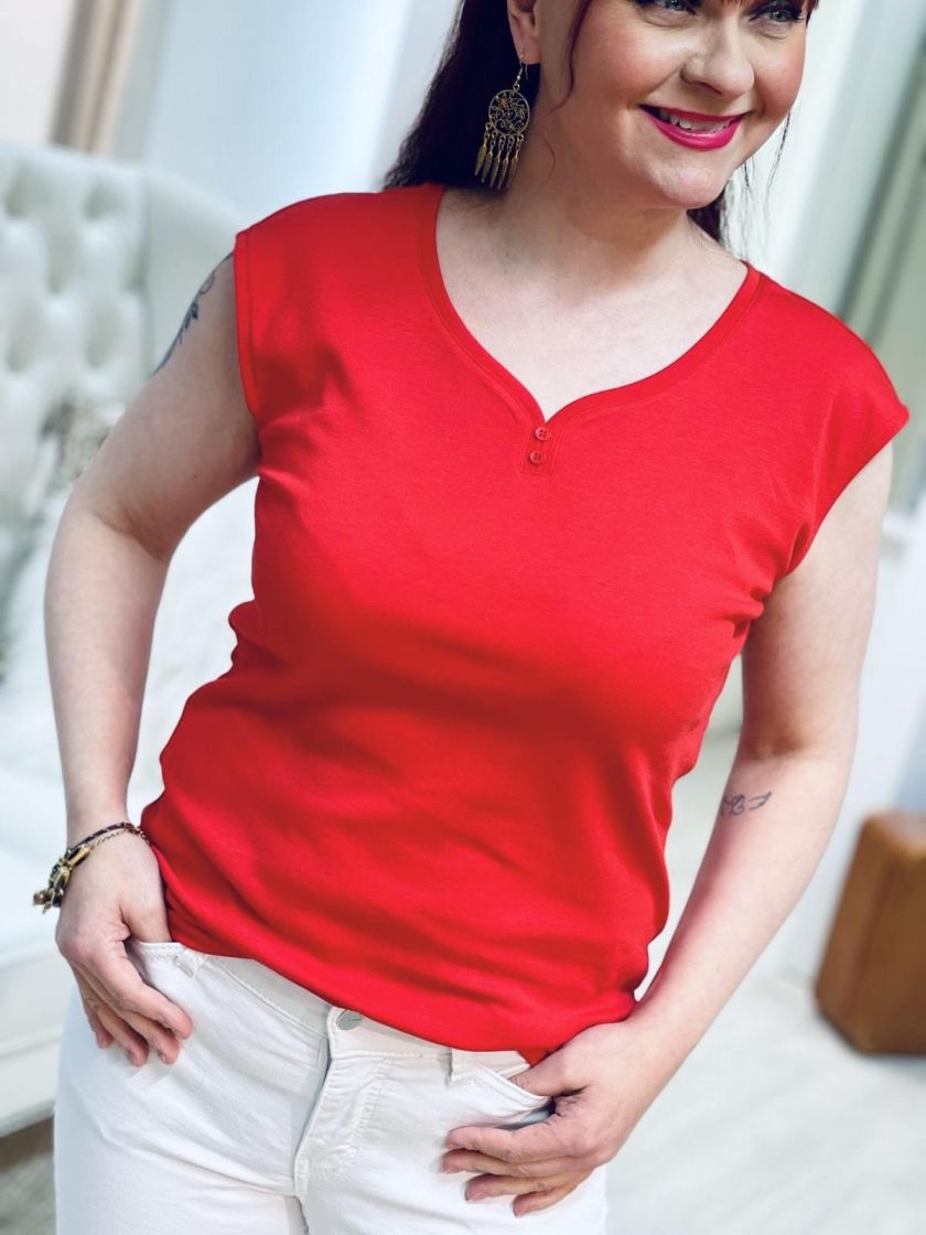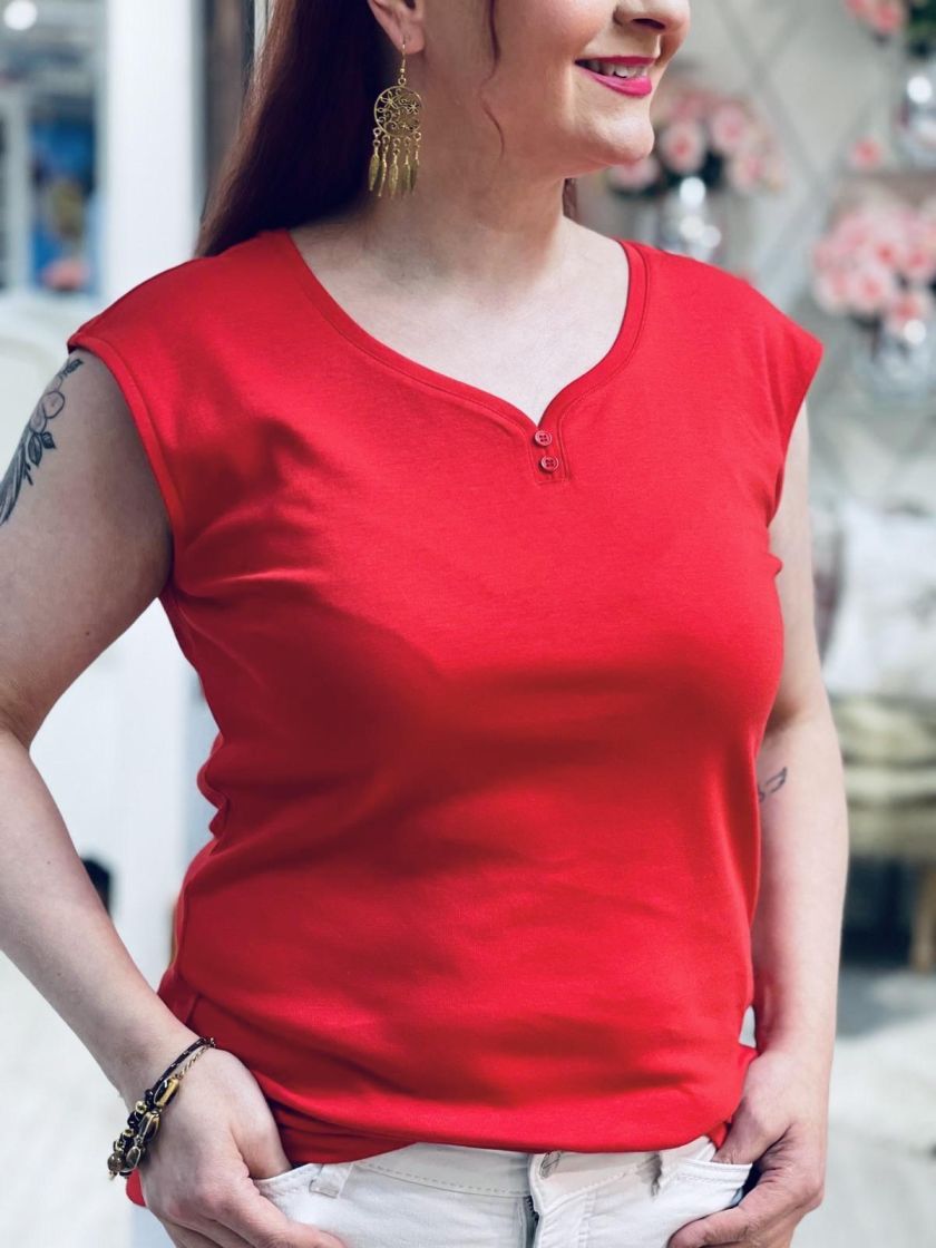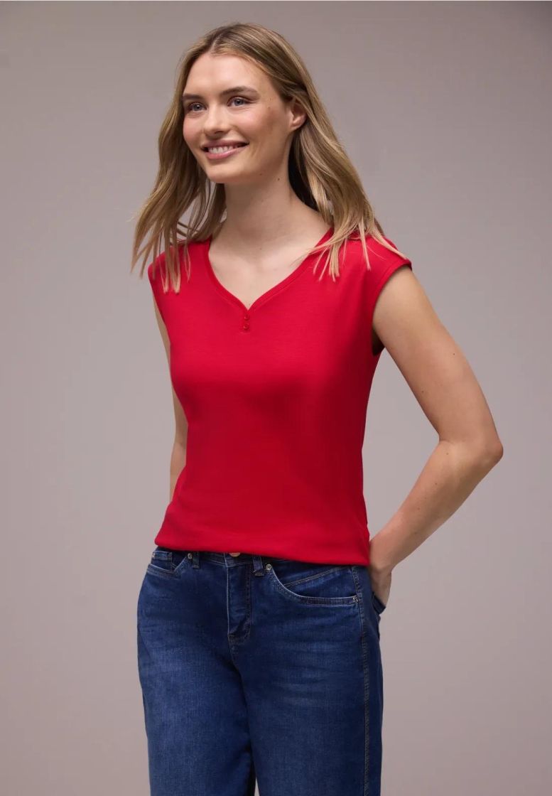 Upea punainen on kesän ykkösvärejä Street One toppi superpehmeää ja joustavaa puuvilla-modaalia. Leveä olkain ja kaunis sydänpääntie napeilla antaa topille tyyliä ja monikäyttöisyyttä. Malli on istuva ja materiaali ihanan hengittävä.