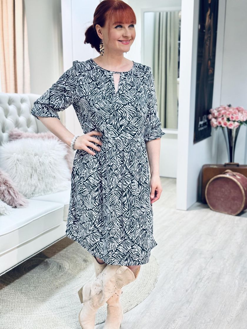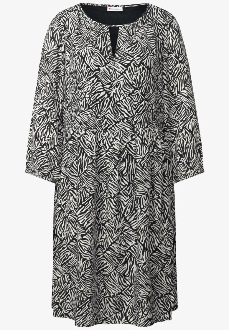 Street On tunikamekko pehmeää kreppiviskoosia. Mekossa kivasti elävyyttä tuo vihreä-kirjava sävy. Mekossa on kaunis pääntie, kivat leikkaukset ja kuminauha hihansuussa. Alla on miellyttävä modaalivuori.