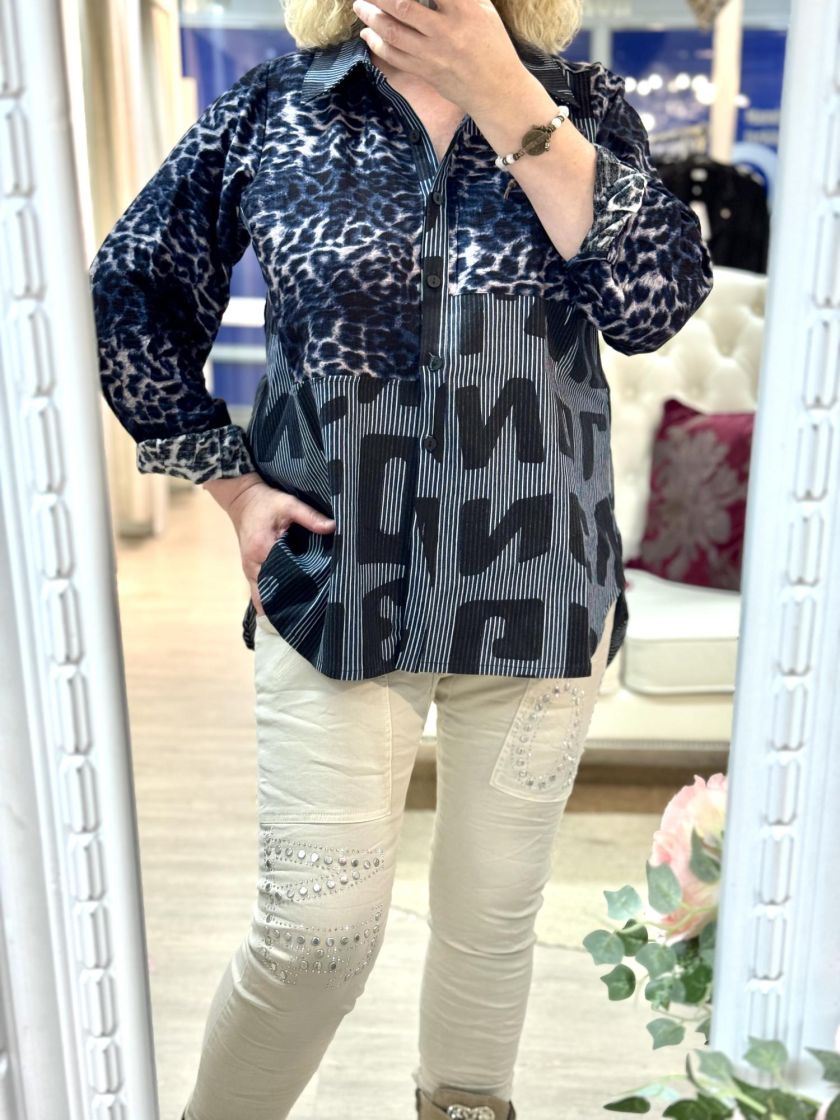 Plusmerkiltä Studio paitis yhdistäen kivasti farkkuhenkistä raita-kirjainkangasta ja leokuosista viskoosisekoitetta. Malli levenee helmaa kohden ja helma on kauniisti kaarrettu sekä takaa pidempi. Edessä on napitus ja hihansuussa nappikaitale. Raitakangas on hieman paksumpaa joustopuuvillaa, leokangas ohutta ja hieman siftavaa viskoosisekoitetta. Mitoitus on reilu, joten tarkistathan mitat.