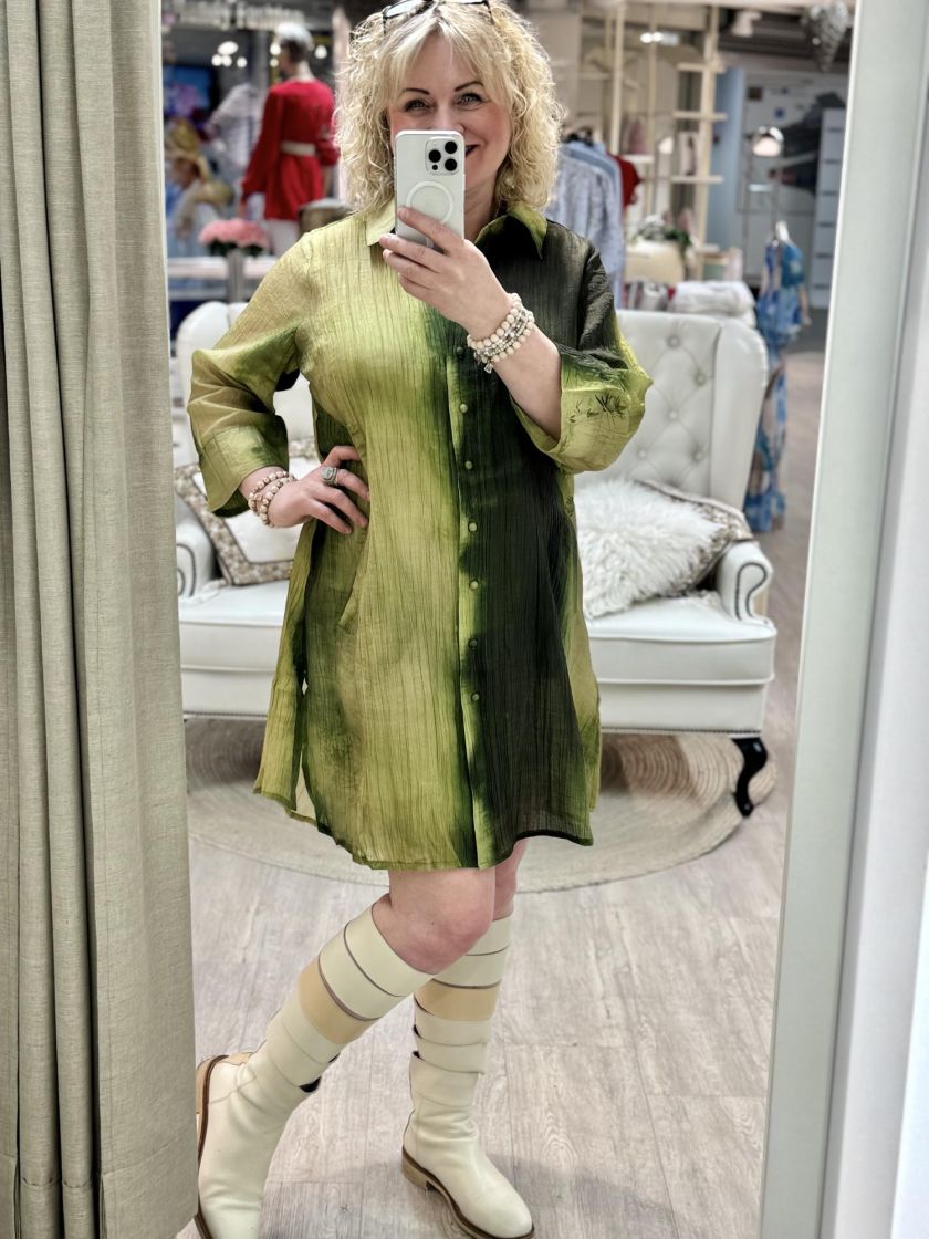 Studio makee vihreäsävyinen paitatunika/mekko. Tämä on kuin maalaus, ja kangas on kivan ryppypintaista mikä tekee siitä eläväisen ja huolettoman. Malli on väljä ja levenee hieman helmaa kohden. Sivuilla tuo keveyttä halkio. Napitus edessä ja taskut tuovat sivuilla rentoutta. Tarkistathan mitat.