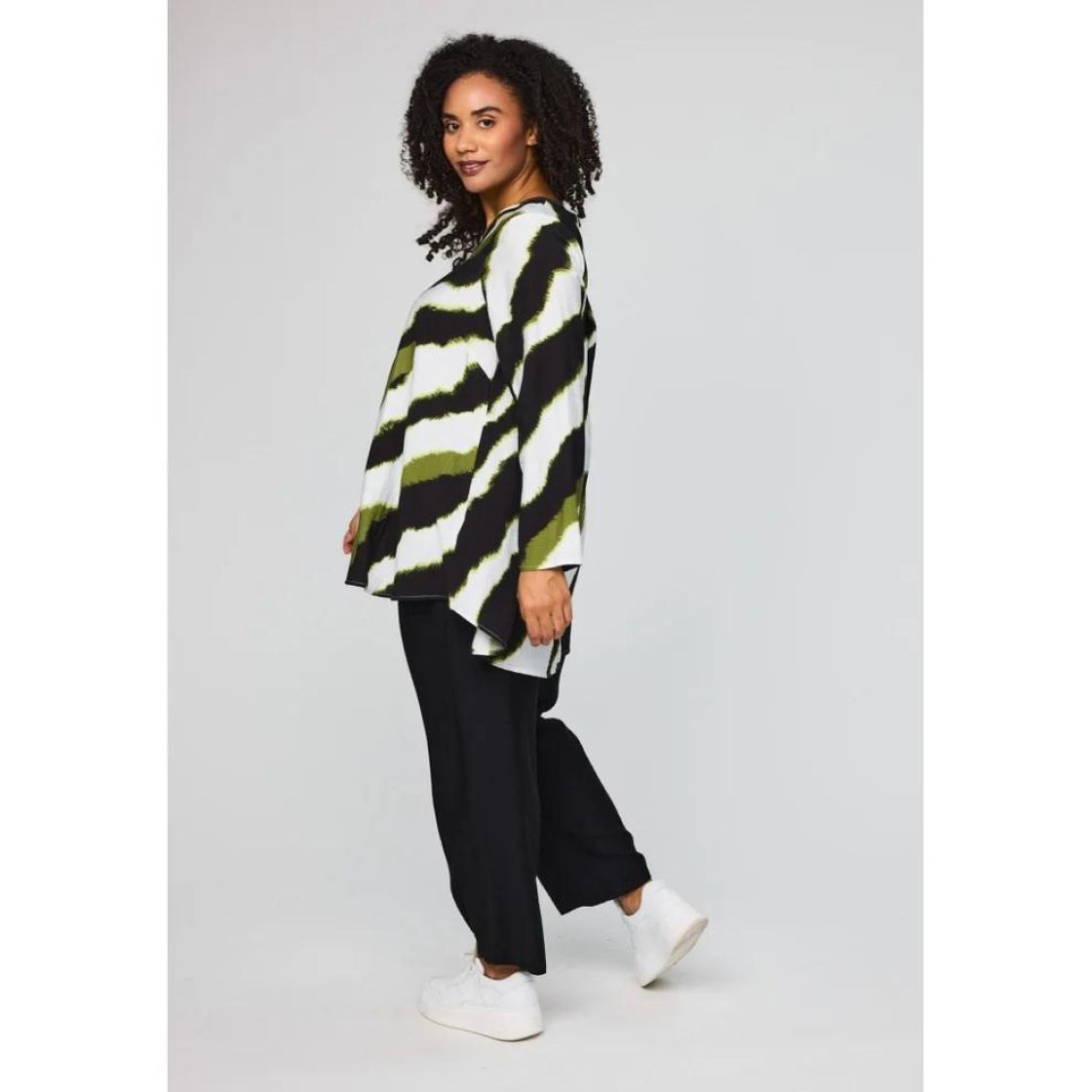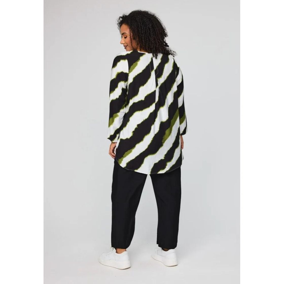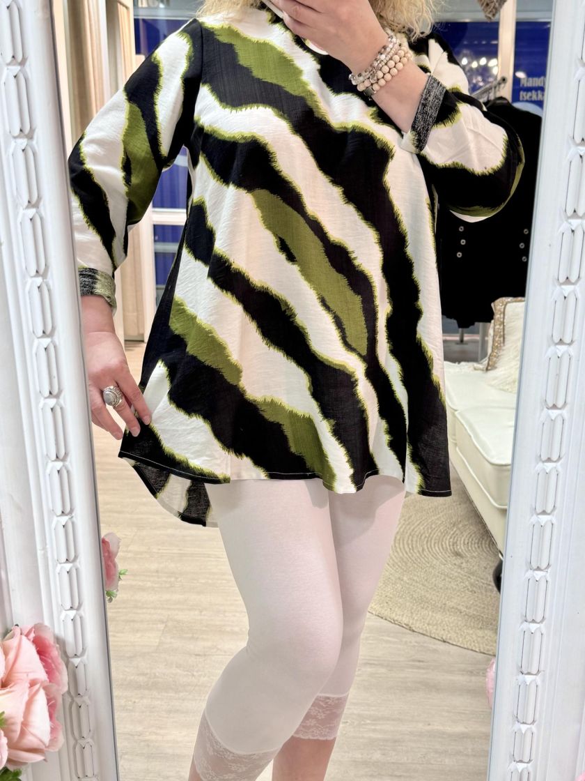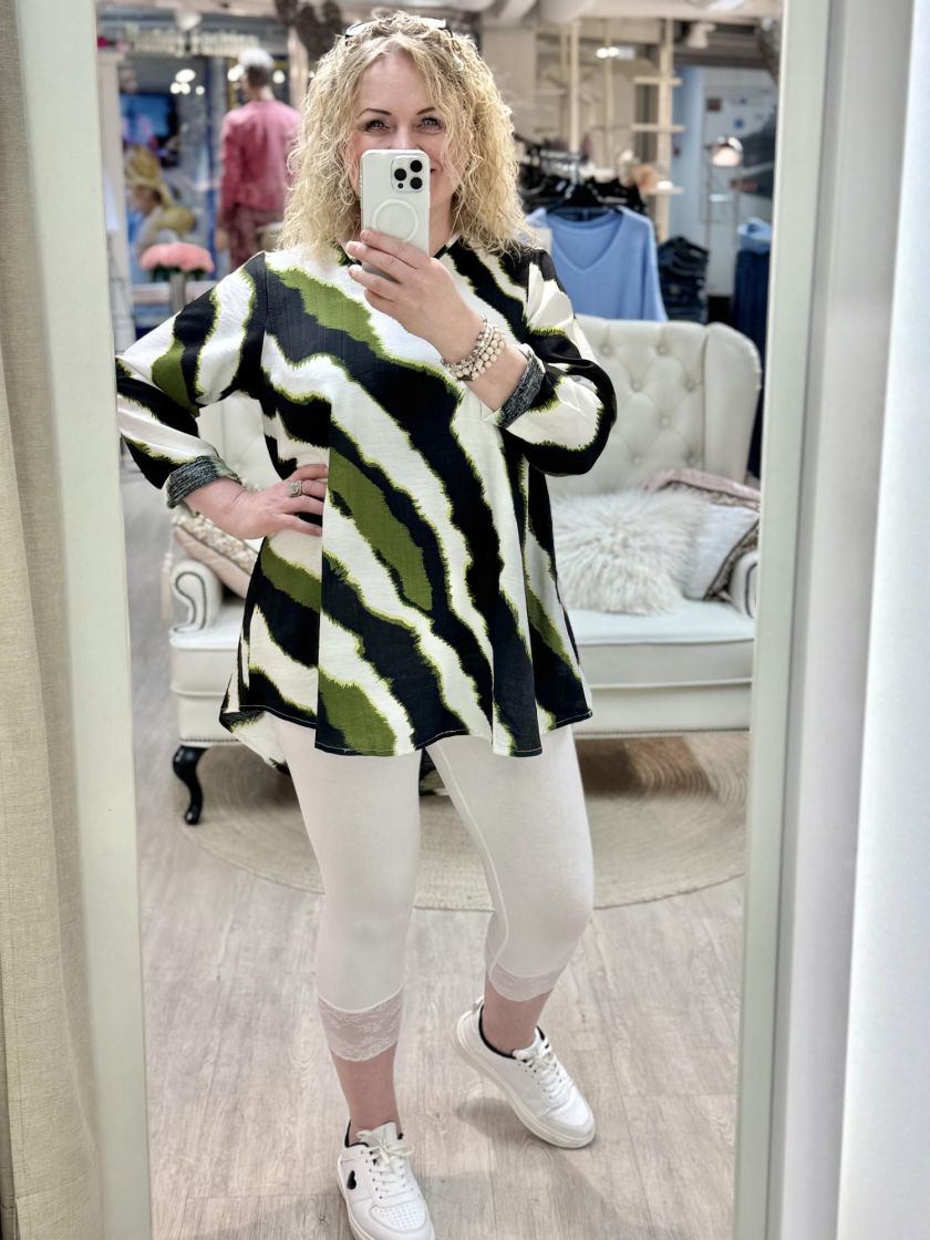 Sopii hyvin housujen ja leggareiden kanssa. Plusmerkiltä Studio a-linjainen tunika kauniisti siftaavaa viskoosia. Takana reilu laskos ja mallin a-linjaisuus antaa liikkuvuutta ja ilmavuutta. Helma on tyylikkäästi takaa hieman pidempi. Malli on väljä, joten tarkistathan mitat.