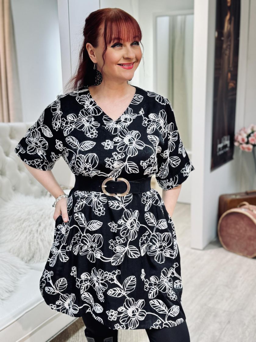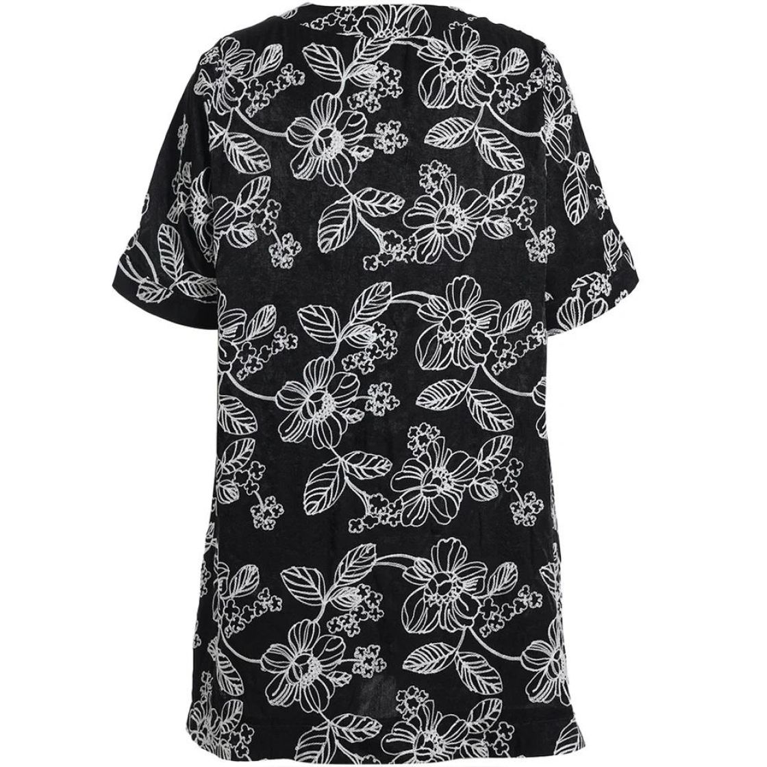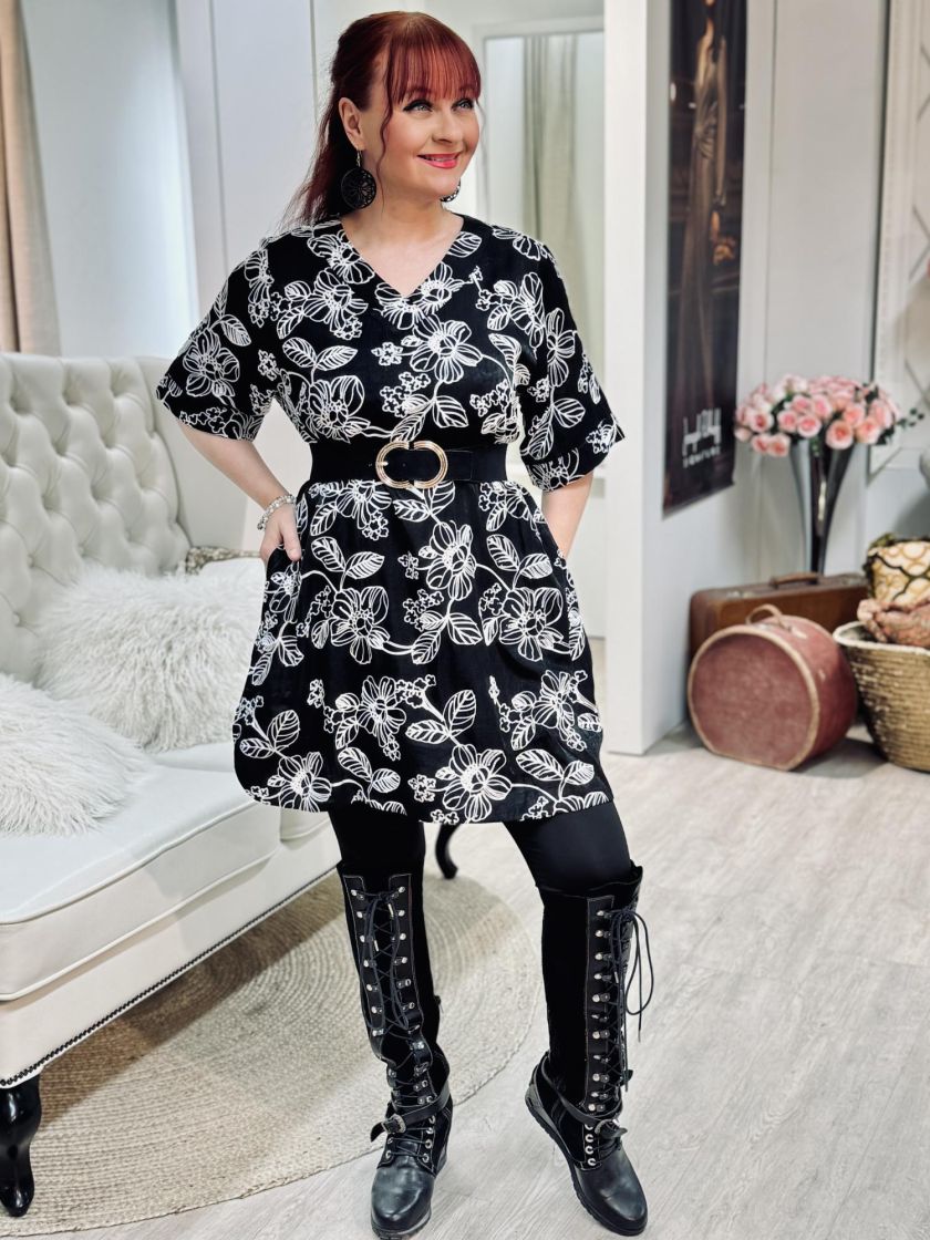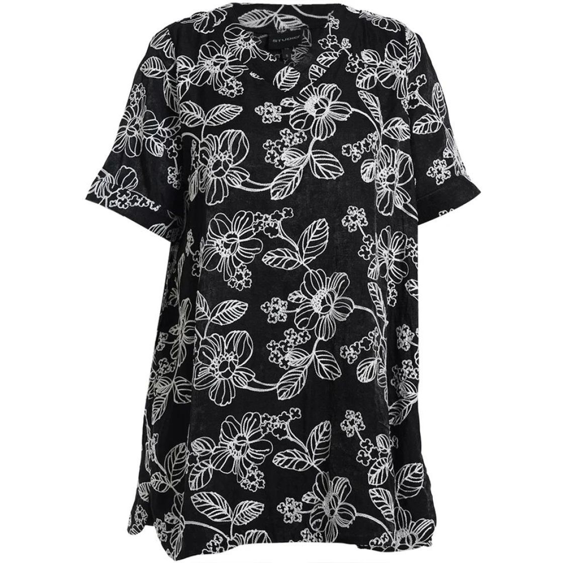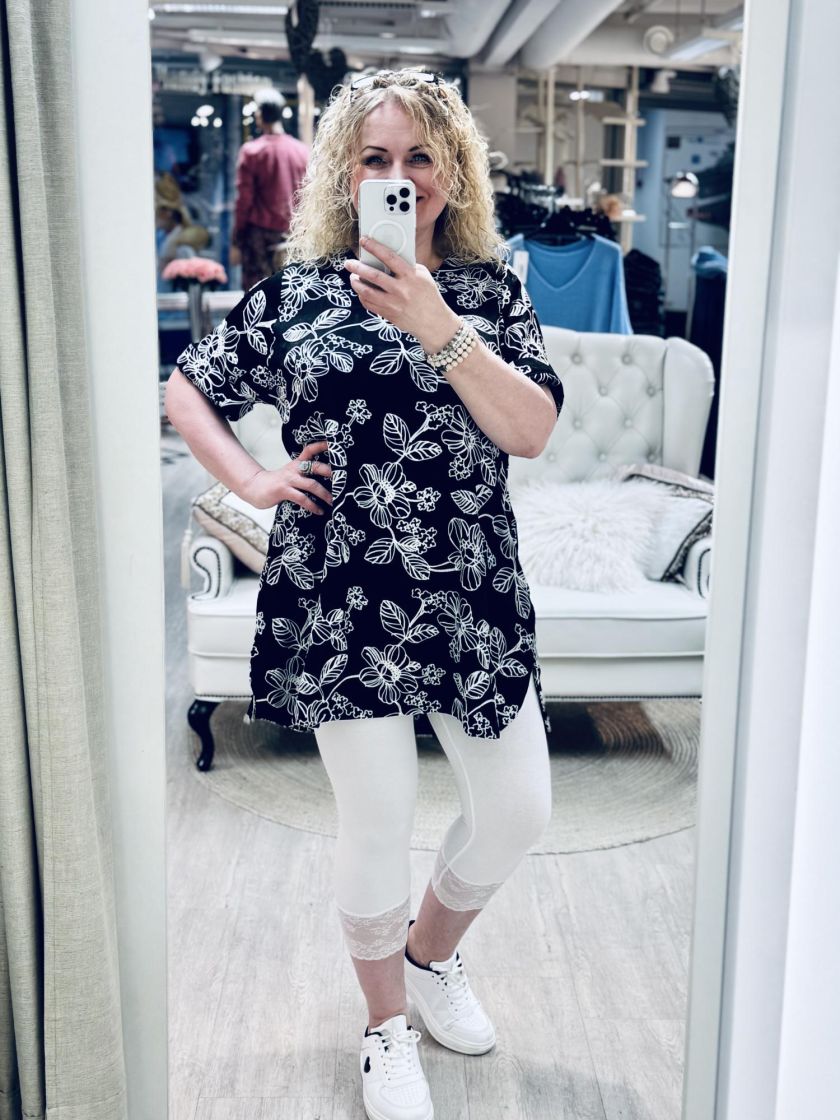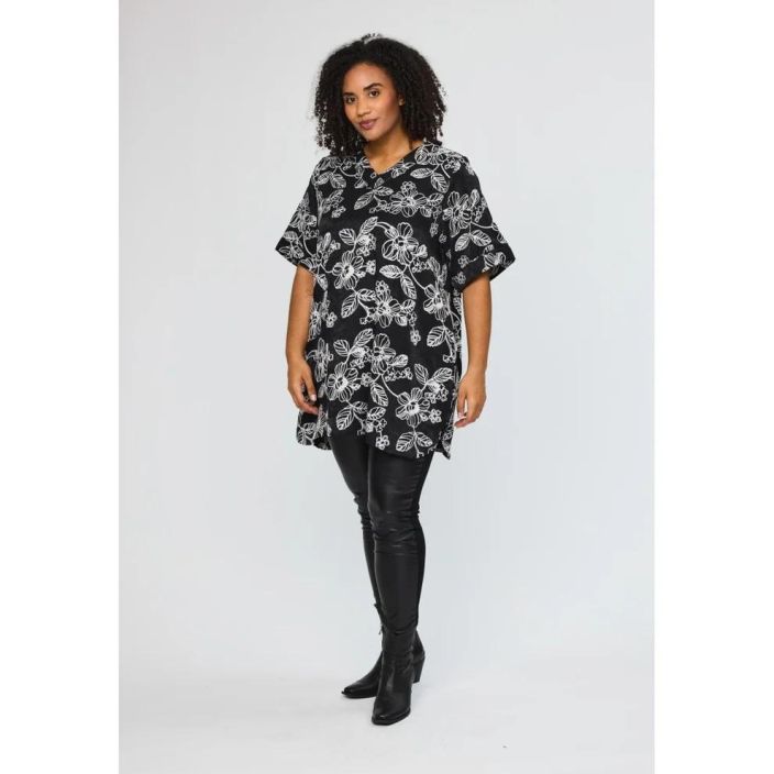 musta-valkoinen toimii aina ja moneen tilanteeseen! Plusmerkiltä Studio tunika reiluilla kukkabrodeerauksilla. V-pääntie ja lyhyt hiha tekee tunikasta kivan kevyen ja hieman levenevä malli antaa ilmavuutta. Käytännöllisyyttä lisää taskut sivuilla. Materiaali on mukavan tuntuista viskoosisekoitetta. Malli on väljä, joten tarkistathan mitat.