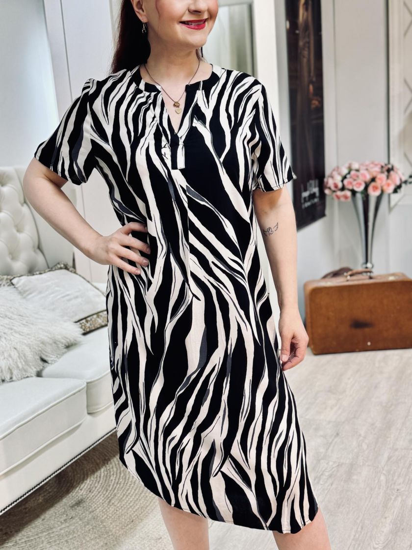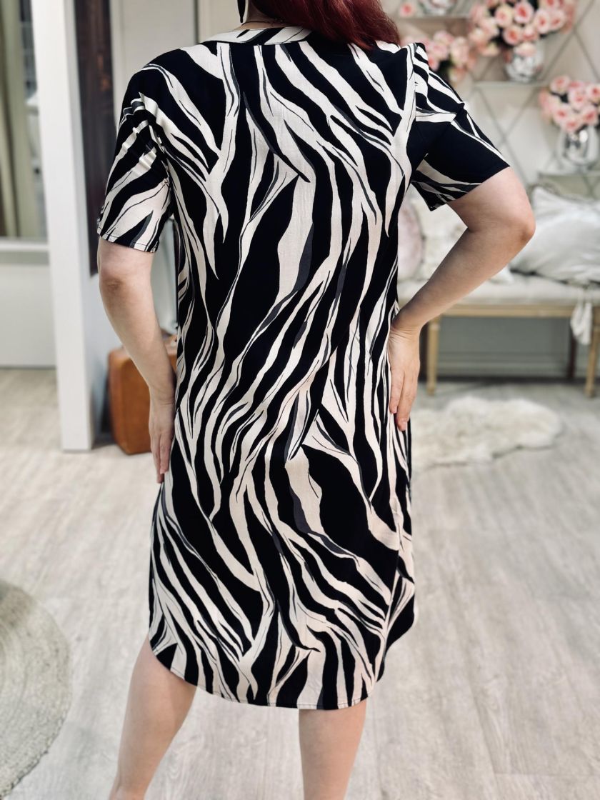 Sunday mekko kauniilla kuviolla. Materiaali todella miellyttävän pehmeää viskoosia. Pääntien alla laskos ja pienet hihat. Malli on suora ja linjakkuutta saa vyöllä.