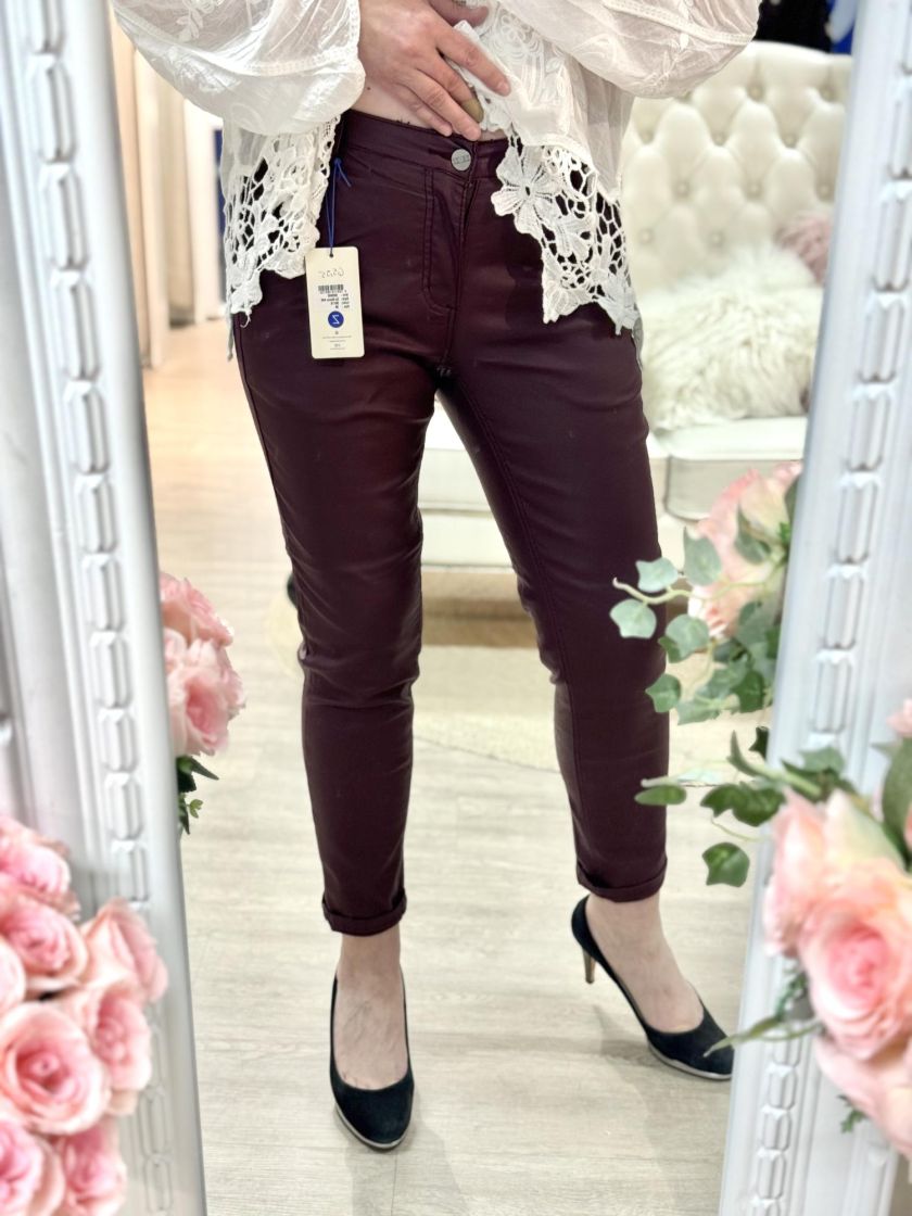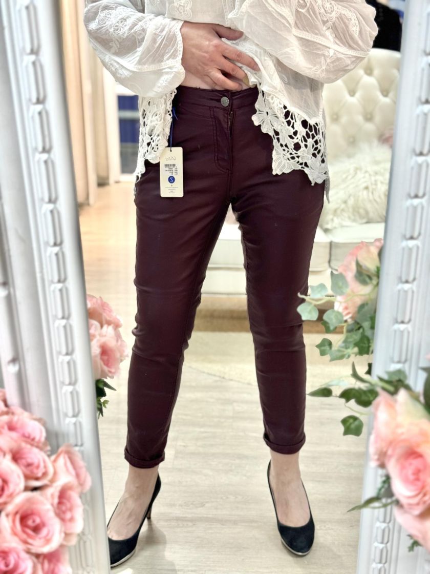 ZE-ZE housut makealla koutatulla kankaalla. Kangas on ohut sekä hyvin joustava ja siinä on vahamainen liukas pinta. Edessä on taskut ja takana valetaskut. Malli on kapeneva ja vyötärönkorkeus normaali. Koon voi ottaa normaalikokoa pienempänä.