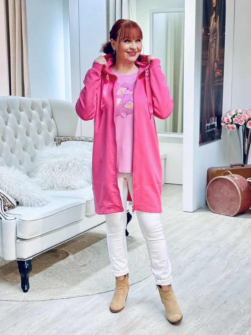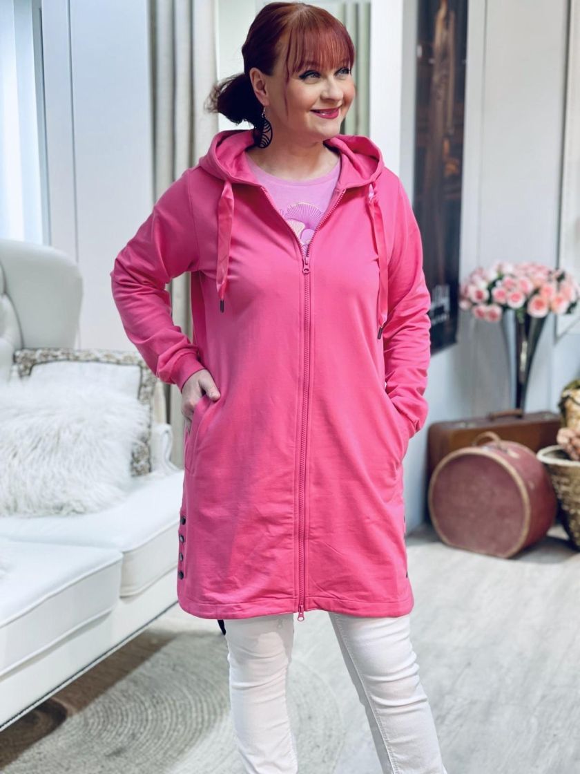 ZE-ZE herkullisen pinkki hupparijakku. Pidempään malliin tuo helppokäyttöisyyttä kahteen suuntaan aukeava vetoketju ja taskut. Helma on kauniisti sivuilta kaarrettu ja lisäjujuna nepparirivi. Huppu on viimeistelty siftaavalla satiininauhalla. Materiaali on hyvin pehmeää puuvillacollegea ja joustaa kivasti.