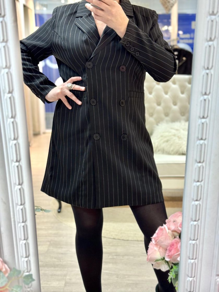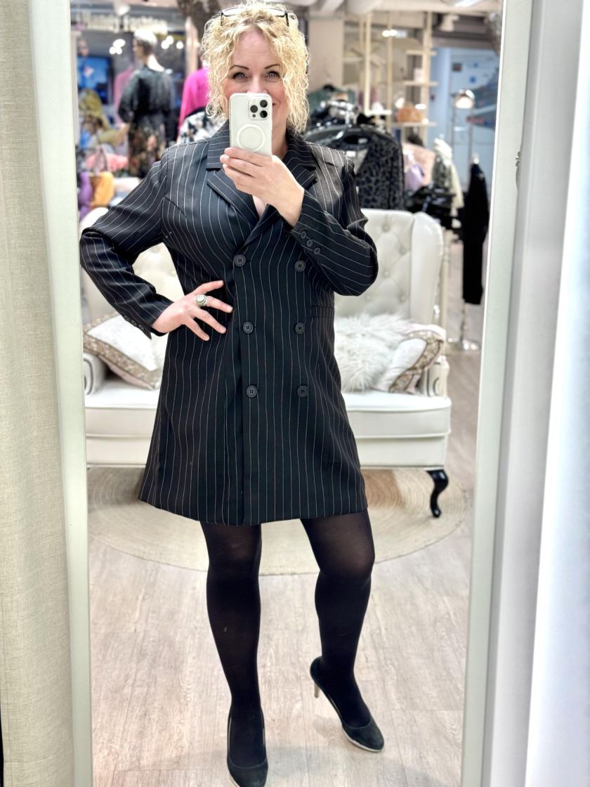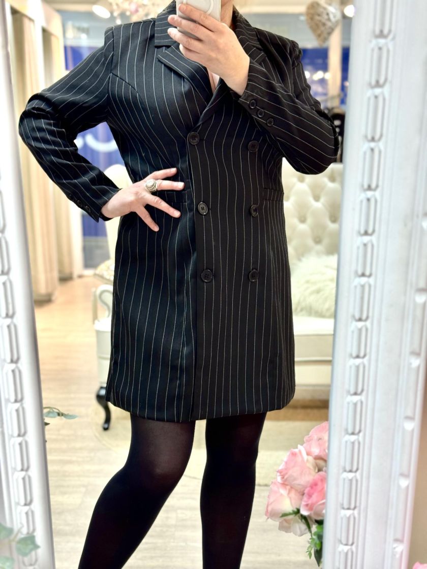 Ze-Ze makea liituraitainen jakkumekko. Mekko on linjakas ja siinä on tyylikäs kaksirivinen napitus. Olkatoppaukset antaa mukavasti ryhtiä ja edestä löytyy taskut. Materiaali on ohutta ja vuori miellyttävän liukas. Tarkistathan mitat.