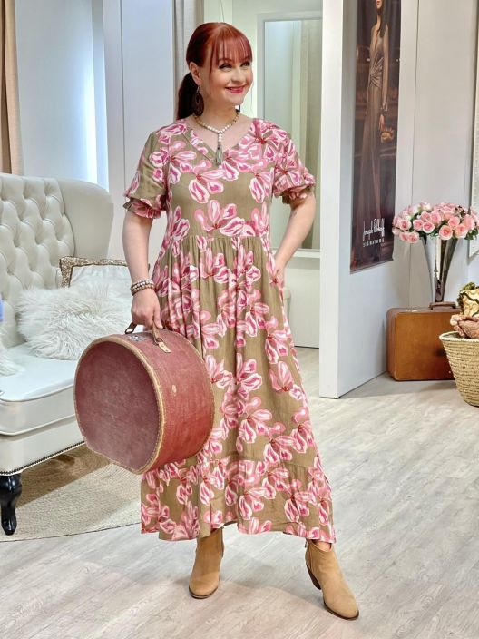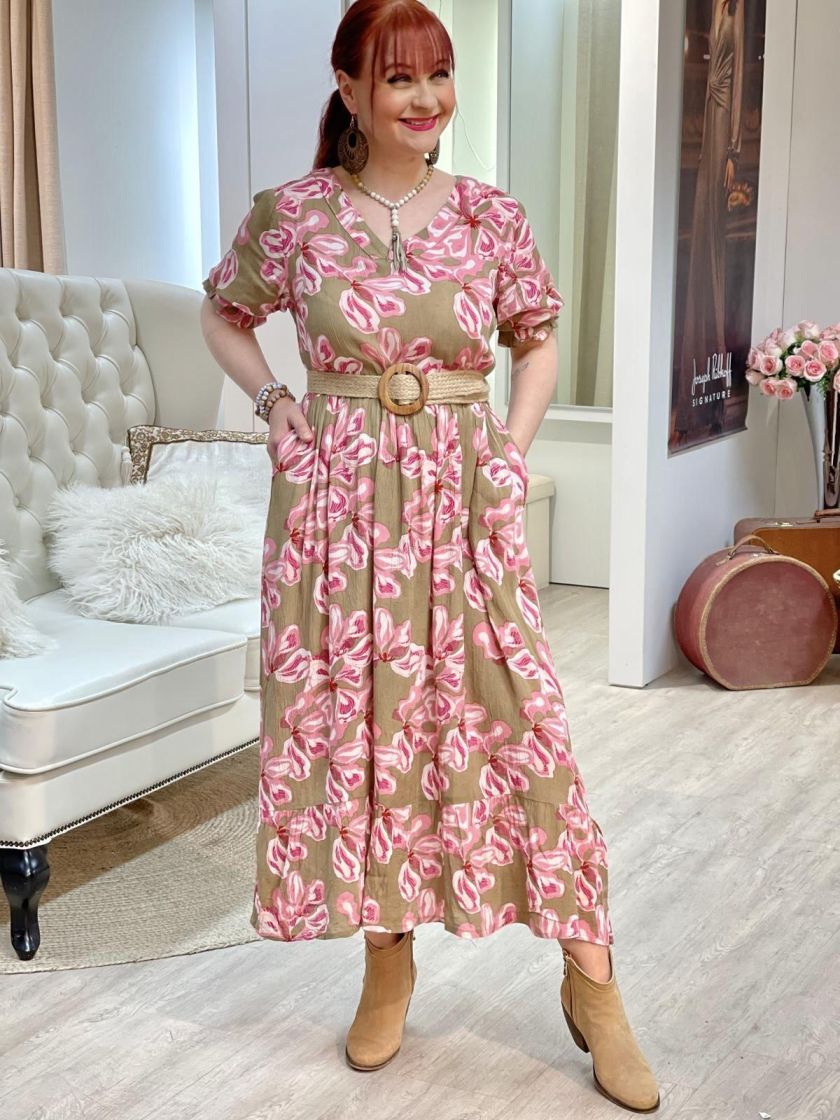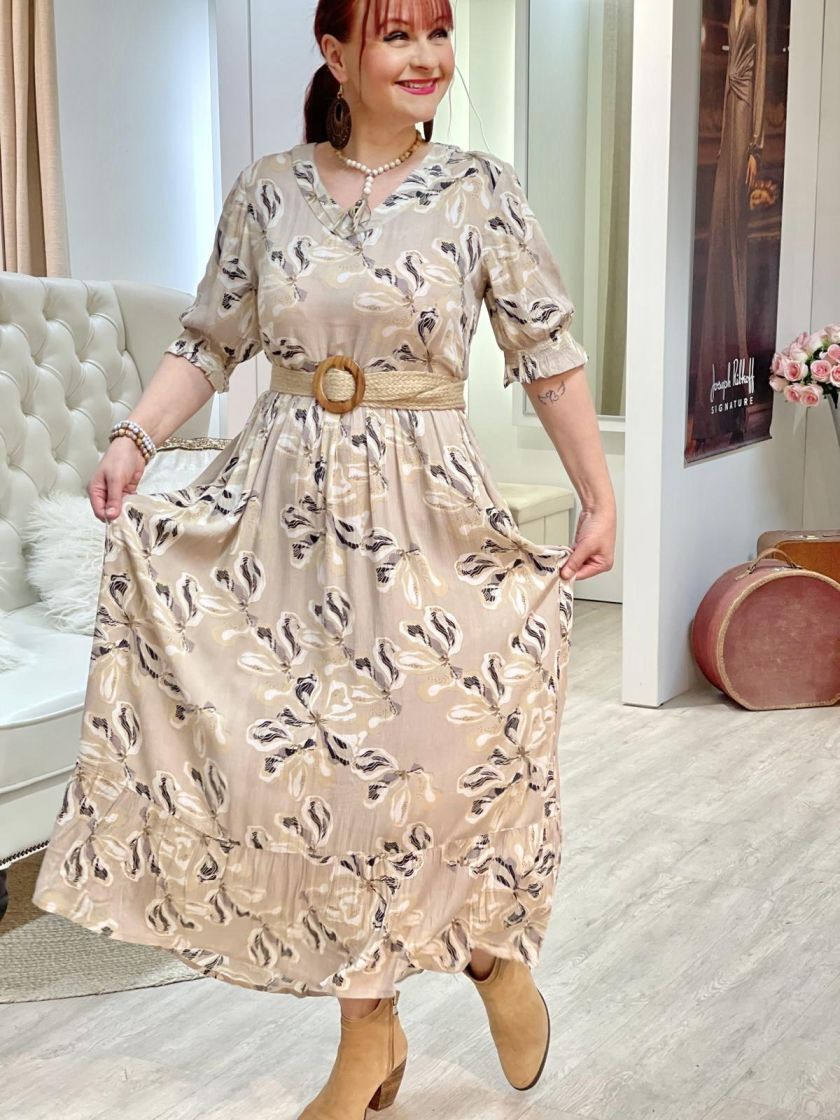 Miten kaunis kuosi kahdessa värissä ja huoleton kreppikangas! ZE-ZE maximekko mukavan ohutta ja pehmeää viskoosikreppiä. Mallissa on ilmava ja kauniisti levenevä helma sekä kiva v-pääntie. Lyhyeen hihaan antaa ryhtiä joustoresori. Malli on väljä.