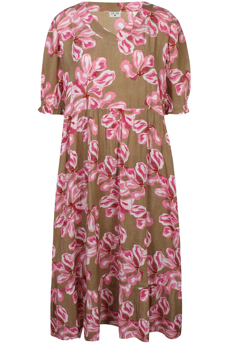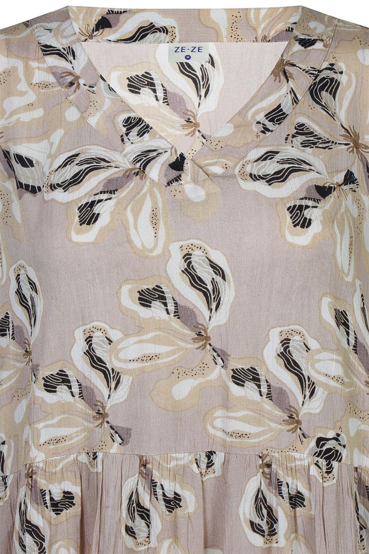 ZE-ZE maximekko mukavan ohutta ja pehmeää viskoosikreppiä. Mallissa on ilmava ja kauniisti levenevä helma sekä kiva v-pääntie. Lyhyeen hihaan antaa ryhtiä joustoresori. Malli on väljä.