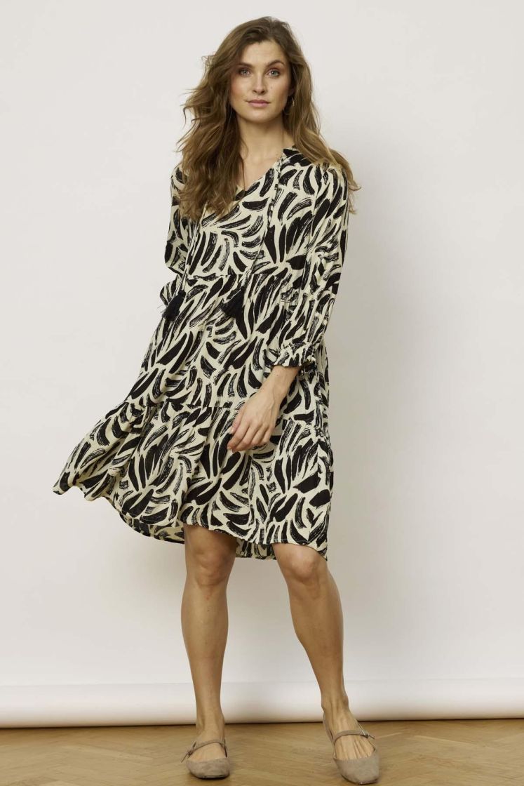 Toimii hyvin myös tunikana kapeiden housujen tai leggareiden kanssa! Ze-Ze a-linjainen mekko mukavan ohutta ja pehmeää kreppiviskoosia. pääntie on kivan avoin ja lisänä on kivat tupsunauhat. Poikkileikkaukset antaa ilmettä ja vajaamittaiseen hihaan ryhtiä joustonauha.