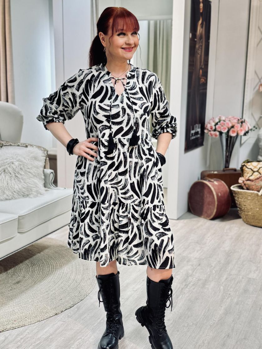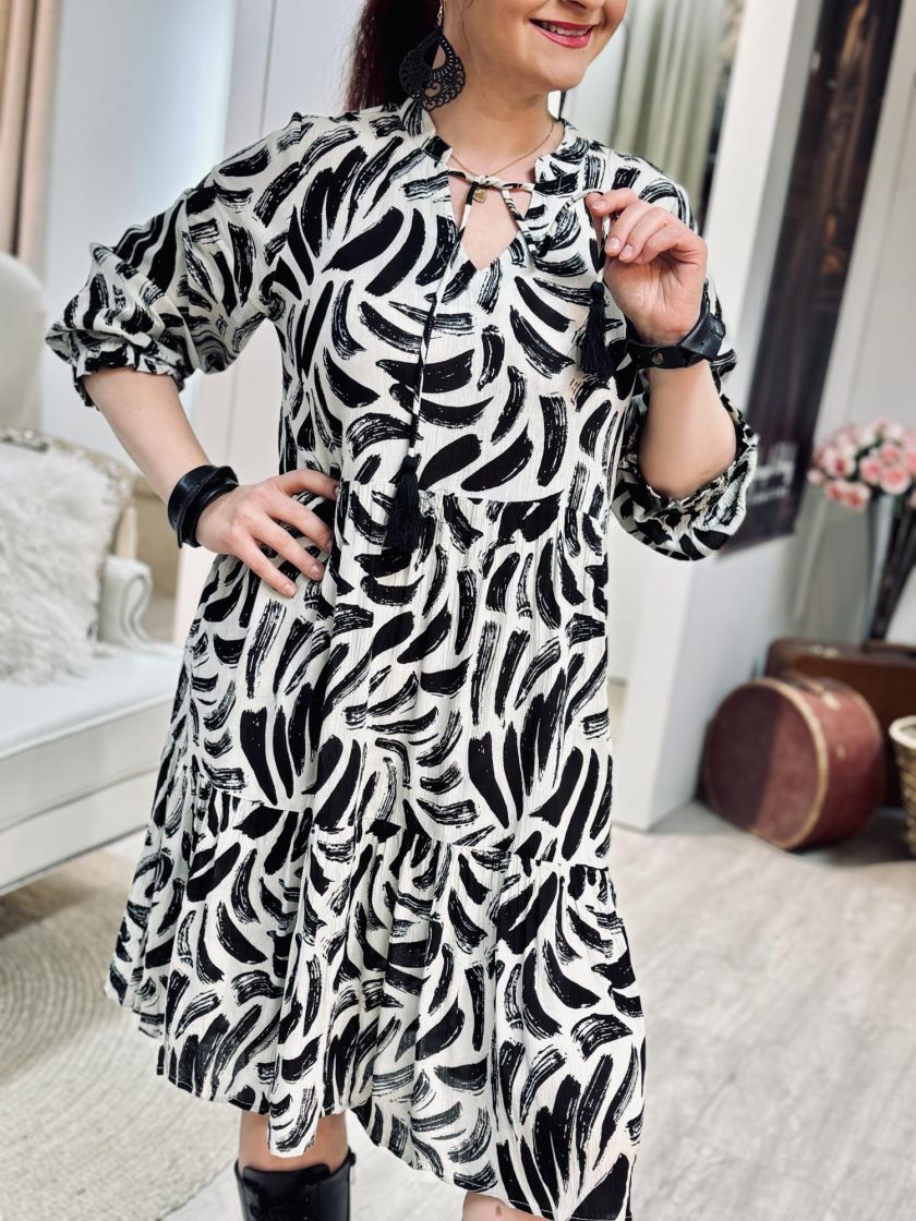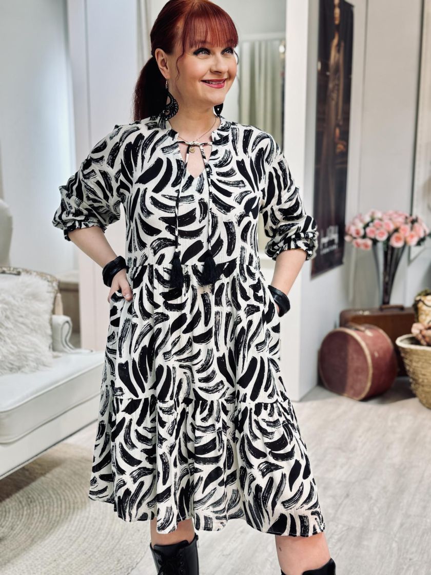 Ze-Ze a-linjainen mekko mukavan ohutta ja pehmeää kreppiviskoosia. pääntie on kivan avoin ja lisänä on kivat tupsunauhat. Poikkileikkaukset antaa ilmettä ja vajaamittaiseen hihaan ryhtiä joustonauha.
