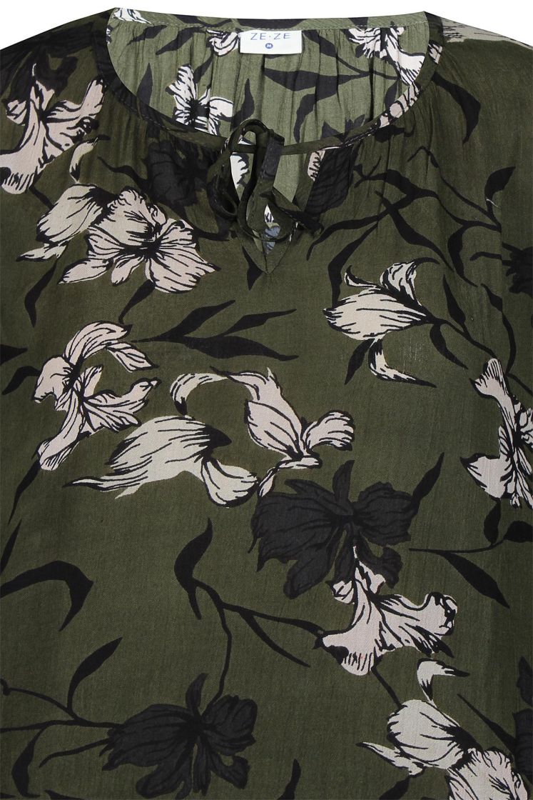 Ze-Ze pusero mukavan ohutta viskoosikreppiä. Pääntiellä on söpöt solmittavat nauhat. Puserossa on reilu hiha, jossa hihansuussa tuo kuminauha ryhtiä. Helmassa halkiot keventää ilmettä. Malli on suora ja normaali mitoitus.
