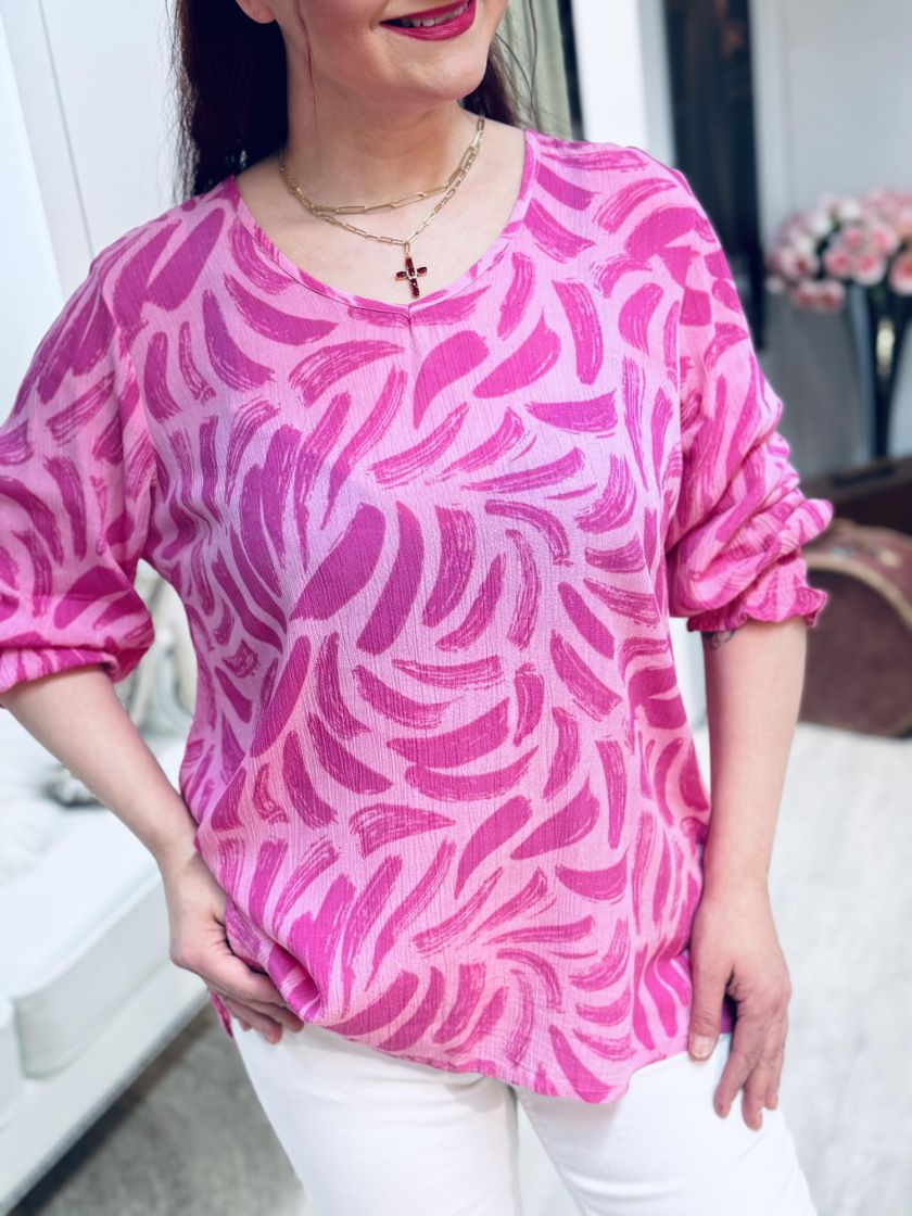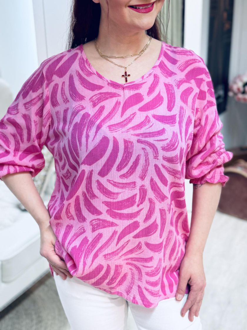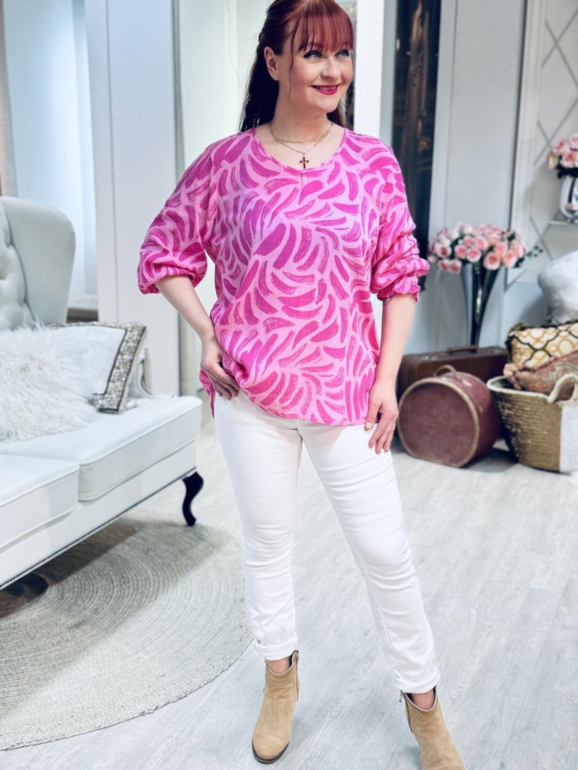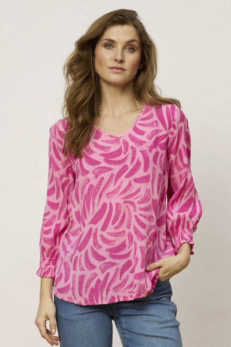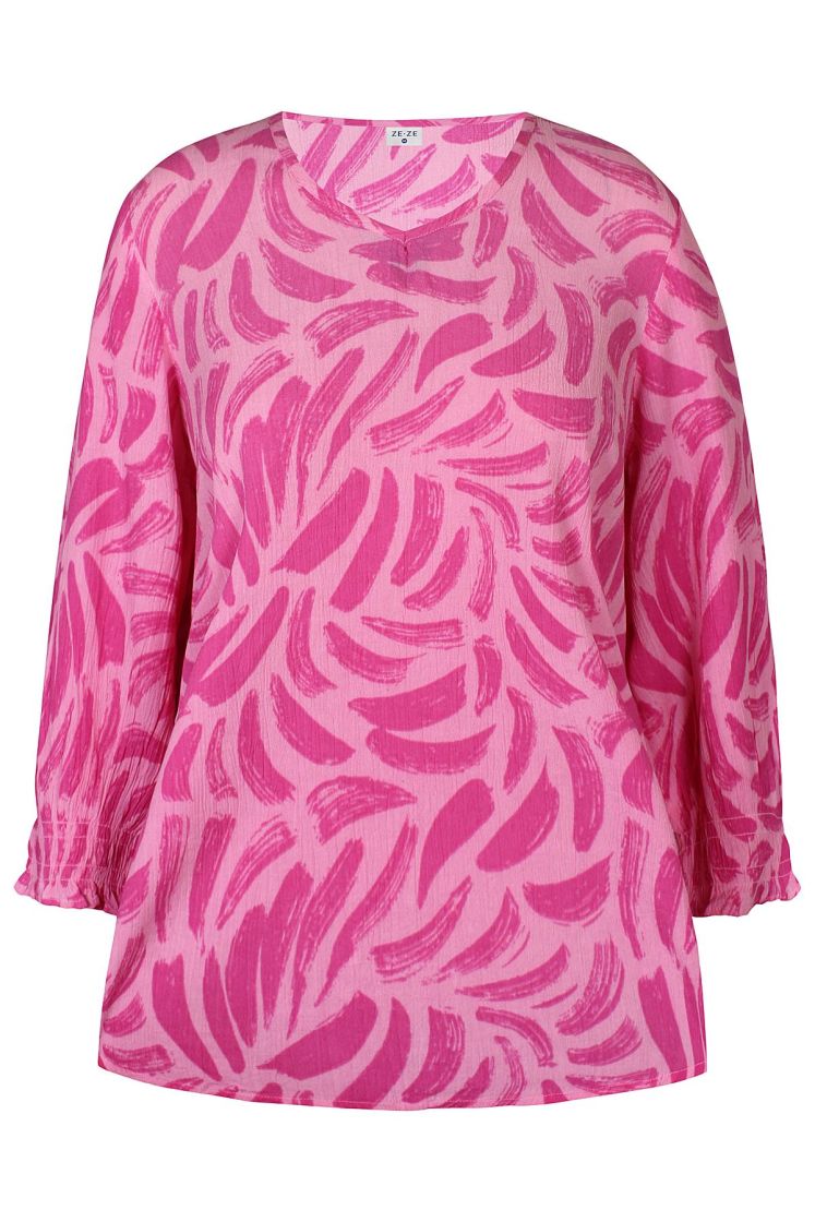 Ze-Ze pusero mukavan ohutta ja pehmeää kreppiviskoosia. pääntie on kivan avoin ja takana ryhtiä tuo kaarroke. Vajaamittainen hiha joustonauhalla tuo kivan kevyen ilmeen. Suora ja väljä malli.
