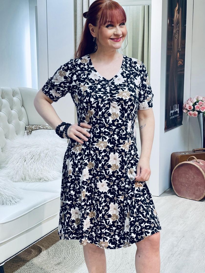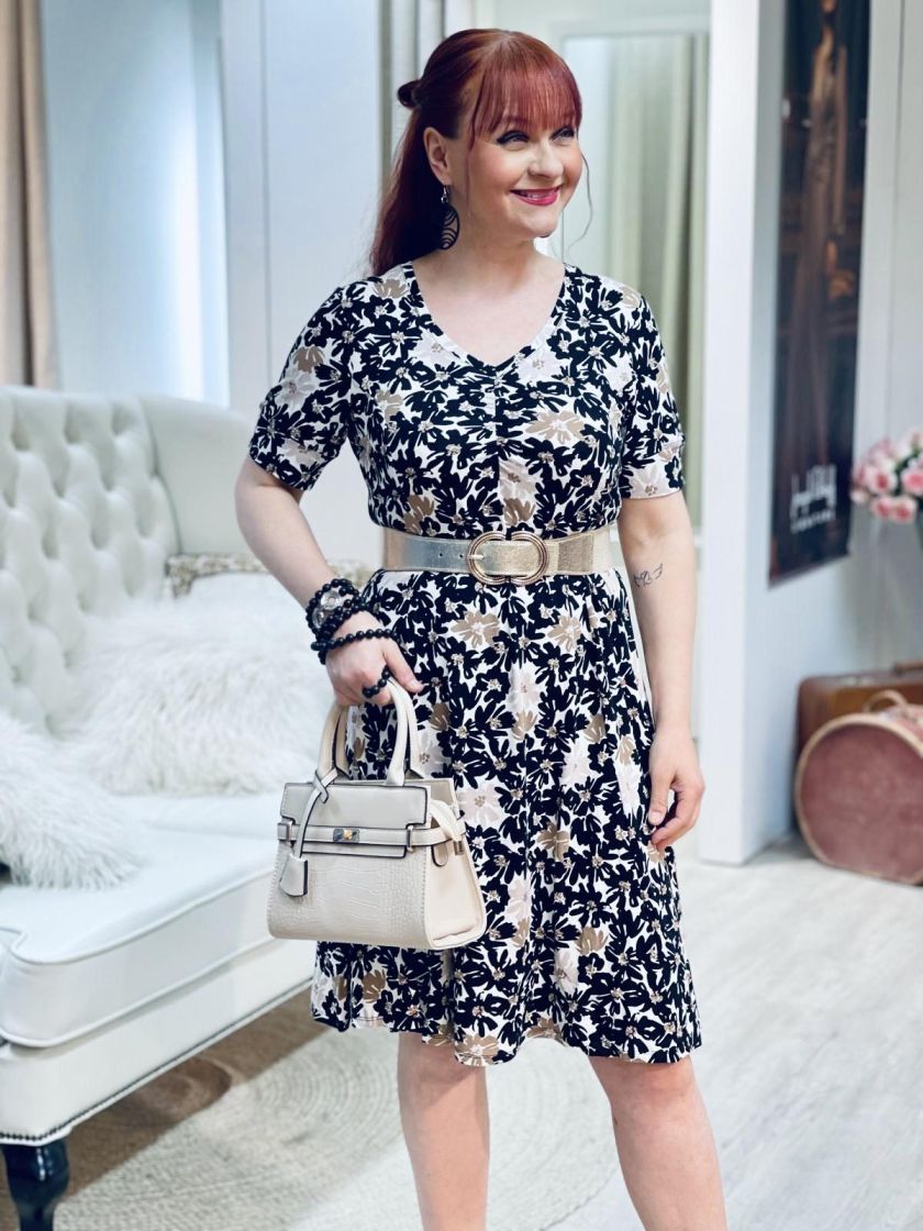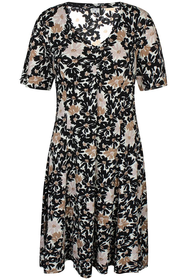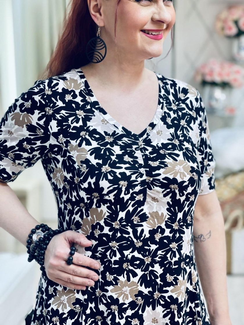 ZE-ZE kaunis sekä linjakas kellohelmainen mekko ohutta ja pehmeää viskoositrikoota. V-pääntien alla ilmettä antaa joustorypytys ja hihansuussa halkion söpö yksityiskohta. Materiaali on todella joustavaa ja miellyttävää päällä.