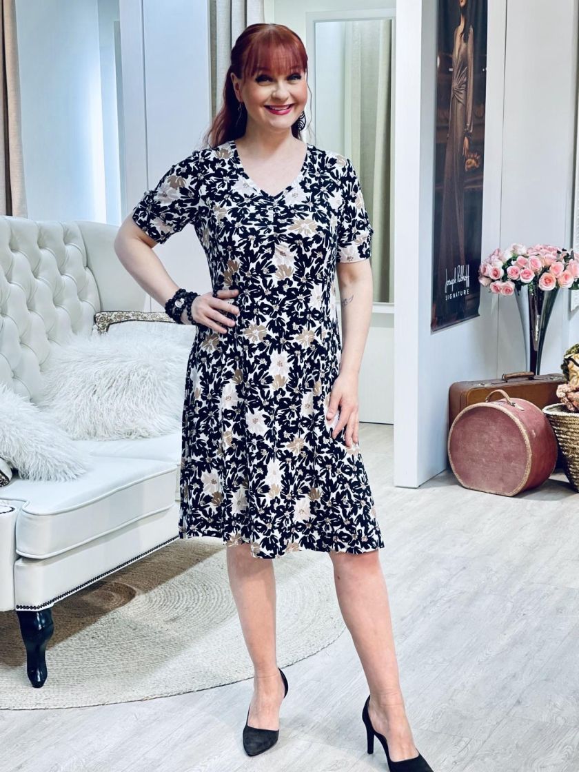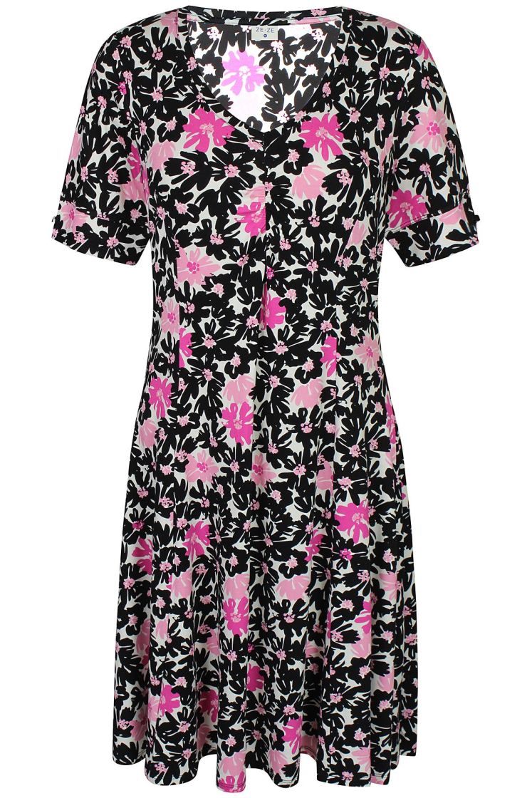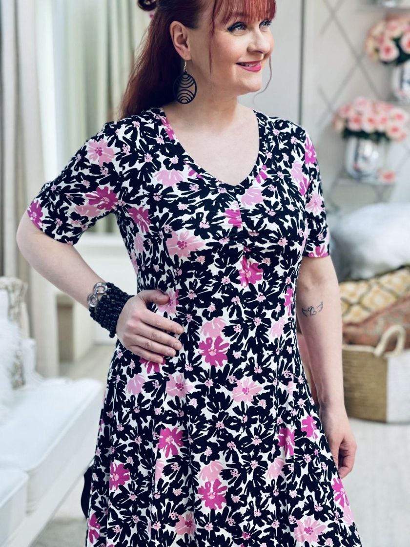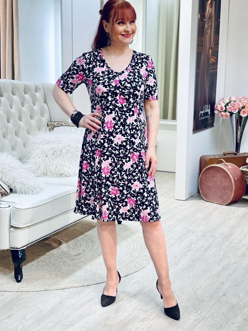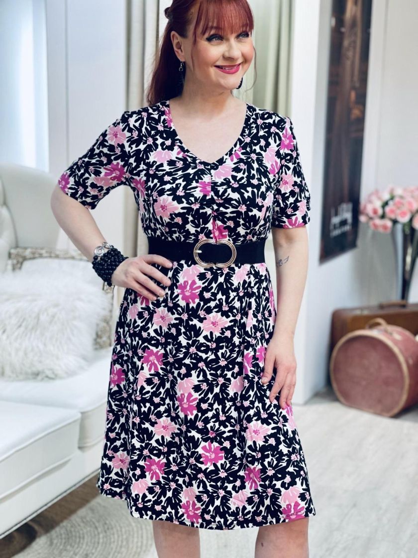 Kaksi kuosin värivaihtoehtoa, pehmeä ruskea ja pirteä pinkki! ZE-ZE kaunis sekä linjakas kellohelmainen mekko ohutta ja pehmeää viskoositrikoota. V-pääntien alla ilmettä antaa joustorypytys ja hihansuussa halkion söpö yksityiskohta. Materiaali on todella joustavaa ja miellyttävää päällä.