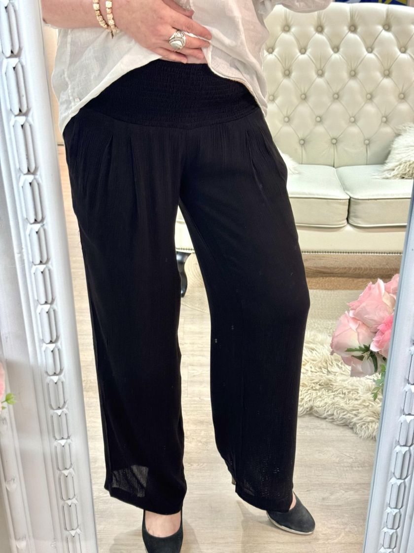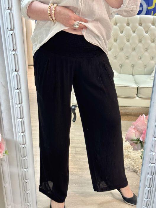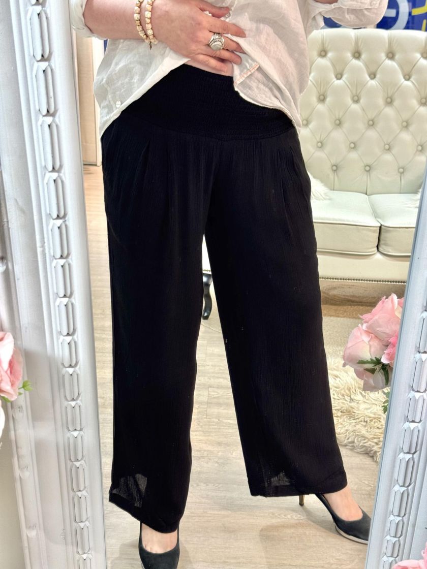 Plusmerkiltä Zhenzi mukavat viskoosikreppi housut. Mukavuutta tuo vyötäröllä leveä kuminauharesori. Mallissa korkea vyötärö ja levenevä lahje. Sivuilla käytännöllisyyttä ja rentoutta tuo taskut. Malli on reilu, jotan tarkastathan mitat.