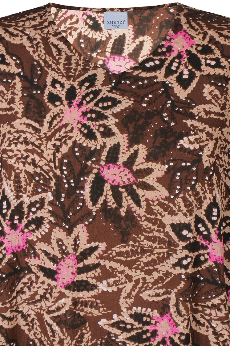 Kaunis suklaanruskea kuosi ripauksella pinkkiä! Plusmerkiltä Zhenzi mekko miellyttävää kreppiviskoosia. Malli levenee hieman helmaa kohti ja helmassa hulmuaa frilla. Kivan väljä hiha antaa mukavasti liikkuvuutta. Malli on väljä, tarkistathan mitat.