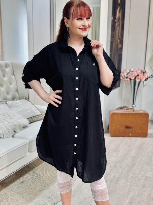 Tyylikäs moneen menoon! Plusmerkiltä Zhenzi paitatunika mukavan ohutta viskoosia-pellava-puuvilla sekoitetta. Edessä napitus ja hiha on kevyesti vajaamittainen ja sitä voi nostaa napin avulla. Helma on kaarrettu. Tarkistathan mitat.