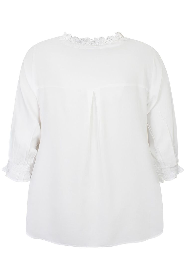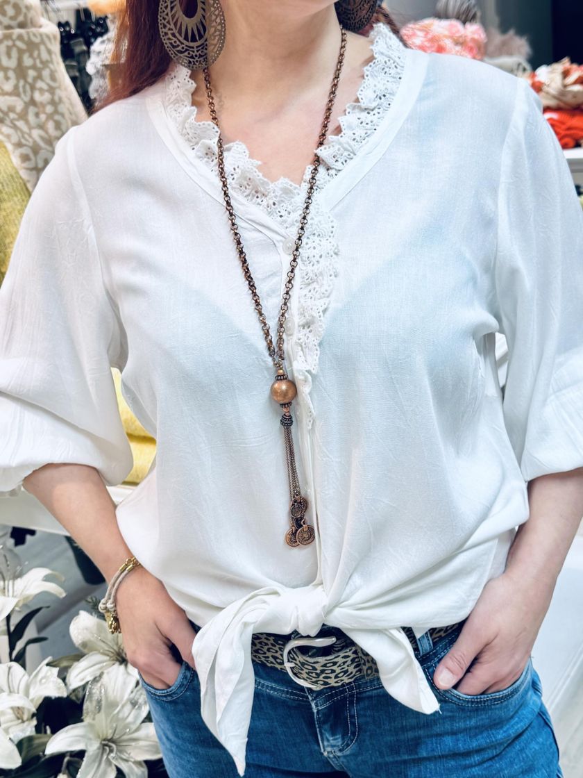 Plusmerkiltä Zhenzi pusero pumpulinpehmeää viskoosia. Romanttinen pitsi kiertää kauniisti pääntien ja takana kaarroke antaa ryhtiä. Hiha on kevyesti vajaamittainen ja hihansuussa jujuna on joustoresori. Napitusta avaamalla pusero muuntautuu myös kevyeksi jakuksi. Tämä malli toimii myös oversize tyyliin pienemmille.