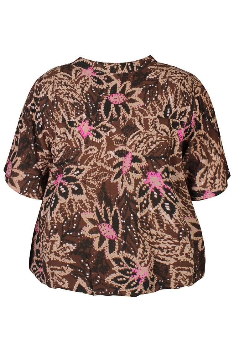 Kaunis suklaanruskea kuosi ripauksella pinkkiä! Plusmerkiltä Zhenzi pusero miellyttävää kreppiviskoosia. Mallissa on kivan avoin pääntie solmittavilla nauhoilla ja helman pitää kauniisti ryhdissä joustoresori. Malli on väljä, tarkistathan mitat.