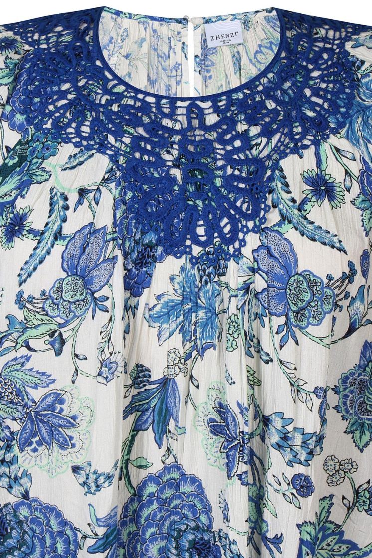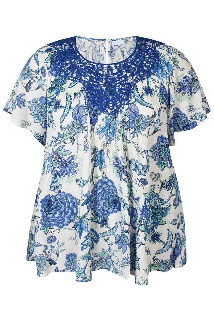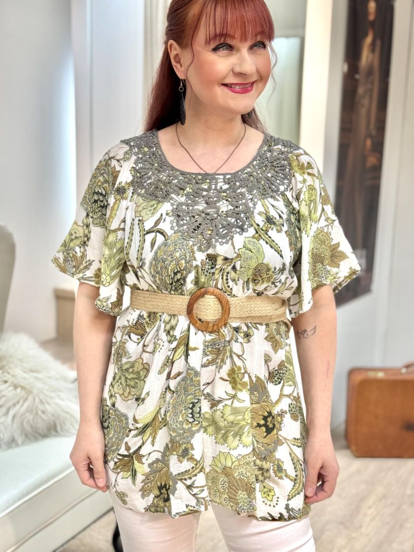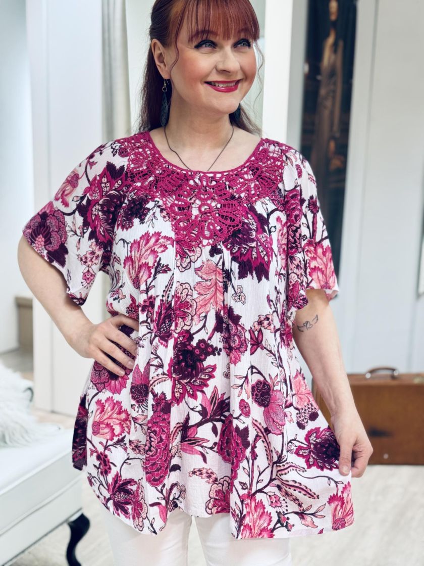 Todella huoleton materiaali ja kaunis kuosi! Plusmerkiltä Zhenzi tunikapusero mukavan ohutta kreppiviskoosia. Pääntiellä ilmettä antaa näyttävä pitsi. Pieni leveä hiha ja malli kauniisti levenee helmaa kohden. Helmi nappi takana. Tarkistathan mitat.