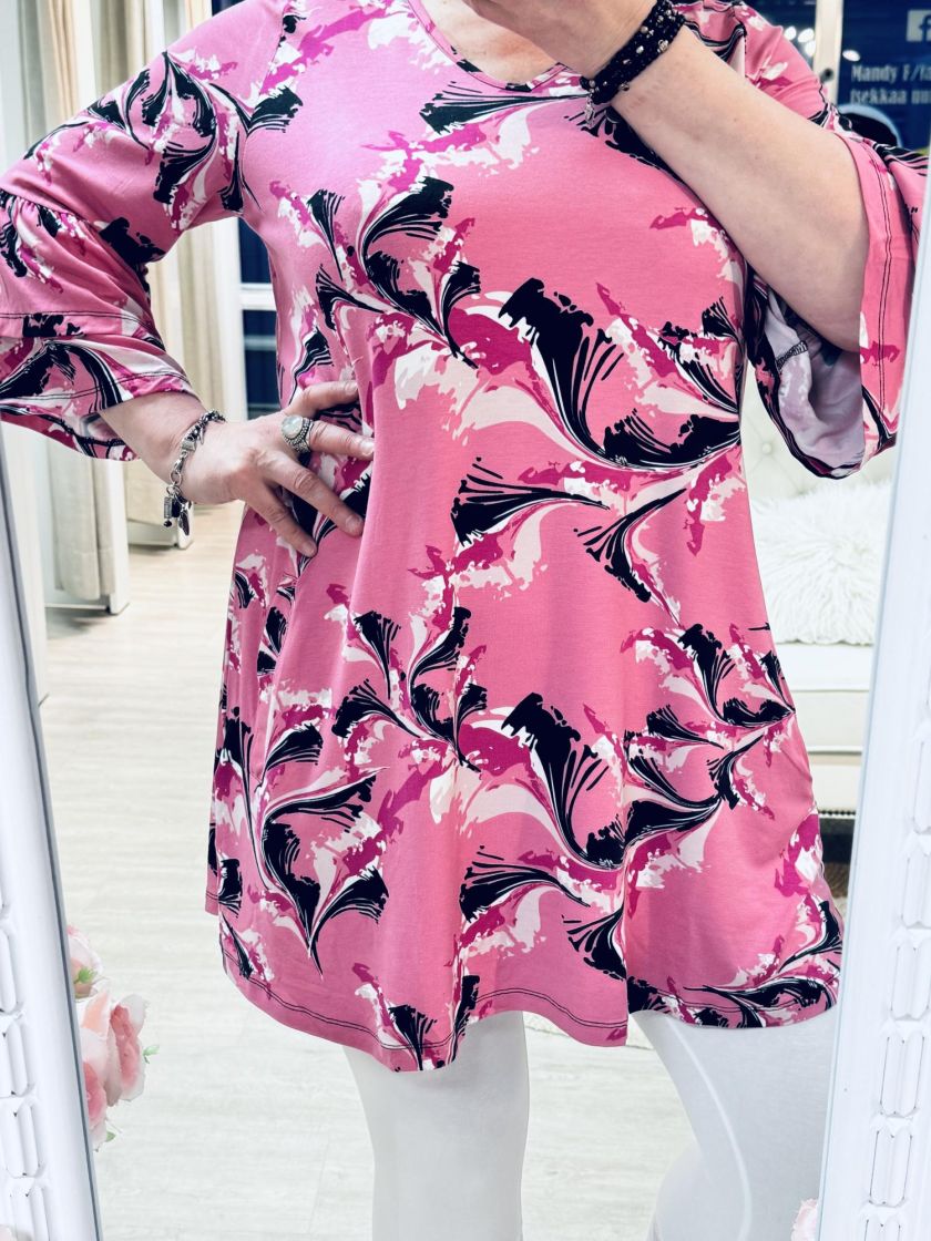 Plusmerkiltä Zhenzi a-linjainen tunika todella pehmeää ja mukavan joustavaa viskoositrikoota. Kivan fiiliksen tekee kerrokselliset frillahihat ja v-pääntie. Edestä löytyy käytännölliset taskut. Tarkistathan mitat.