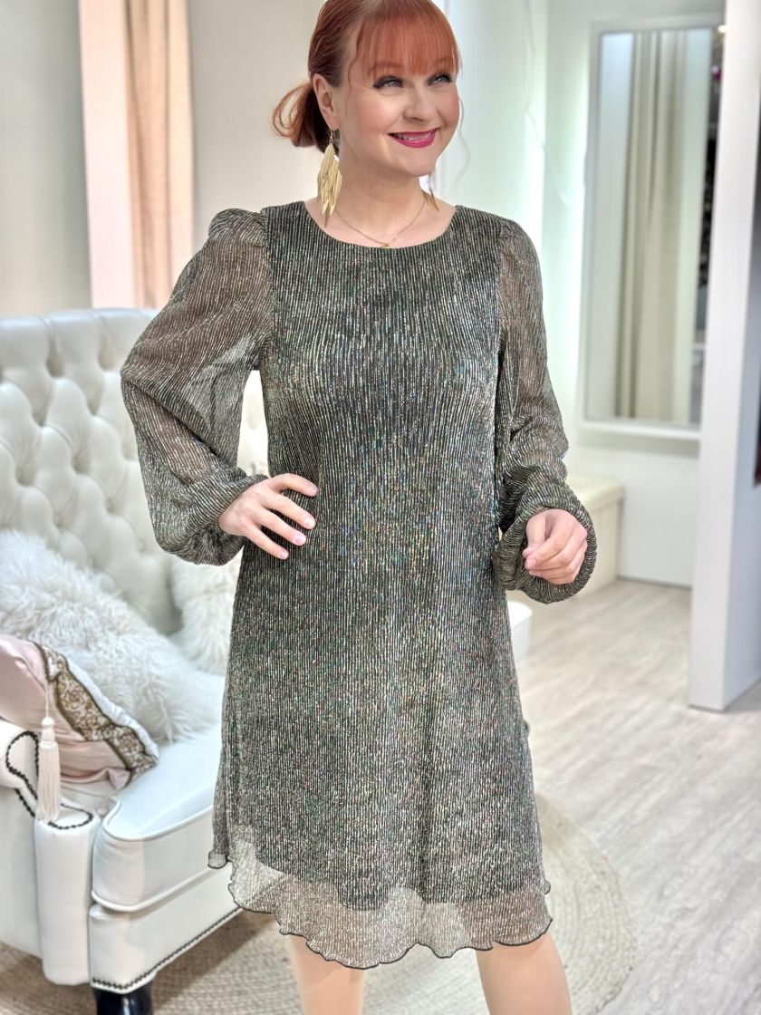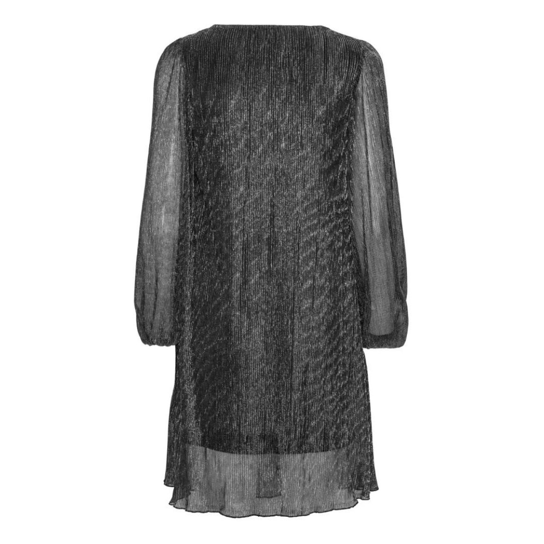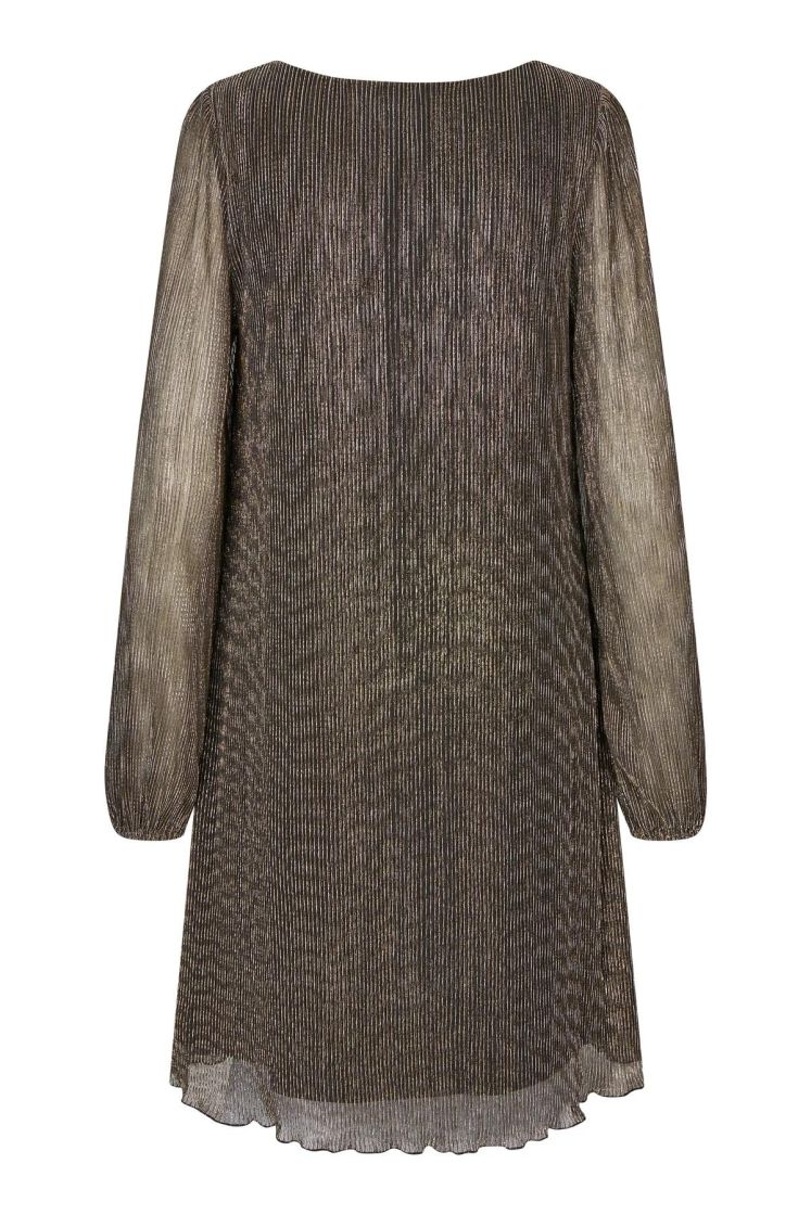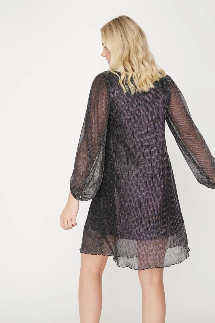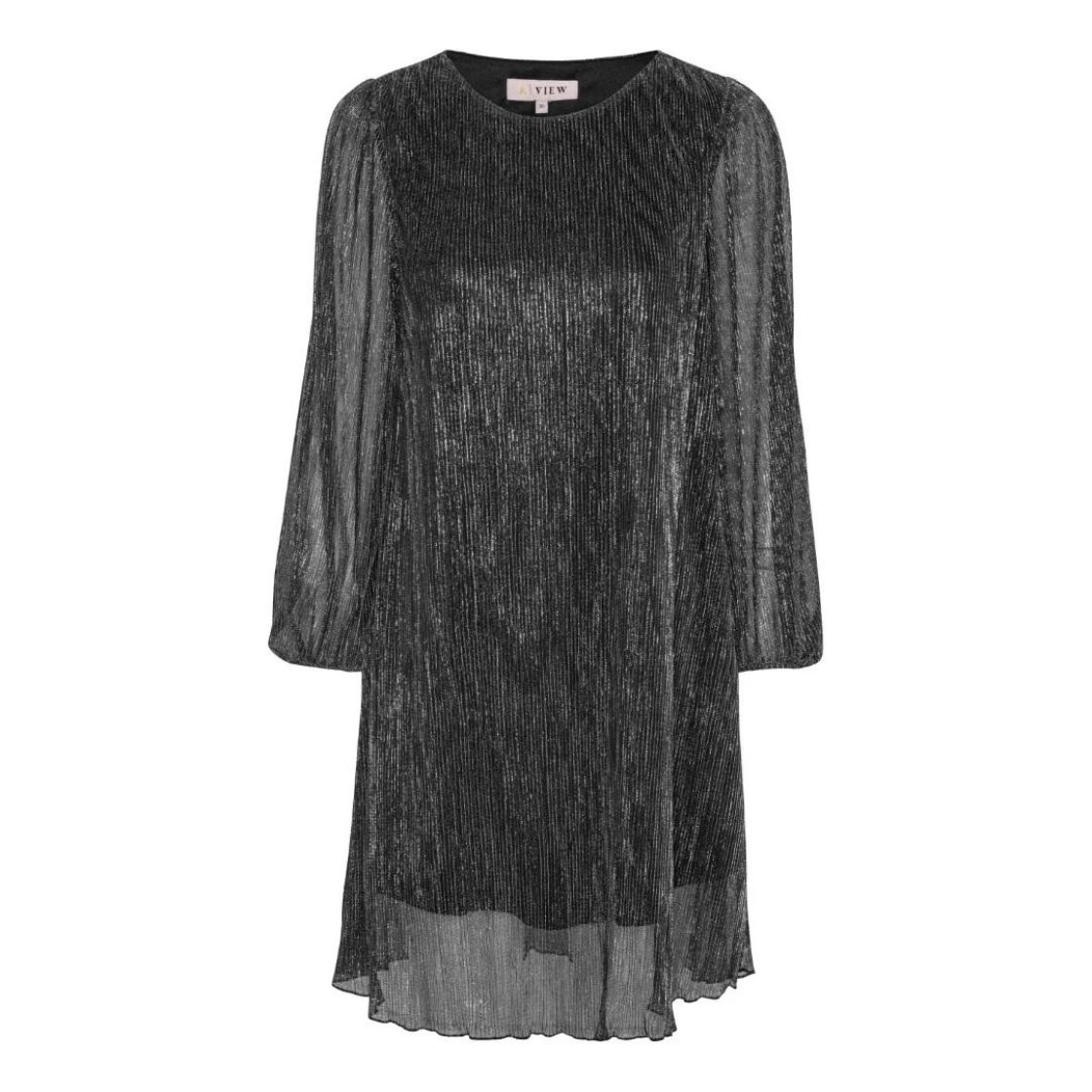 A-VIEW upeasti kimaltava mekko. Läpikuultavassa kankaassa kimmeltää metallilangat ja alla on vuori. Eri valoissa mekko kimaltaa eri väreissä. Materiaali on hyvin joustavaa ja malli levenee hieman helmaa kohti. Mekko on hyvin mukautuva päällä. Hiha on kivan reilu ja hihansuussa ryhtiä tuo kuminauha. Vuori on joustavaa ja liukasta trikoota.