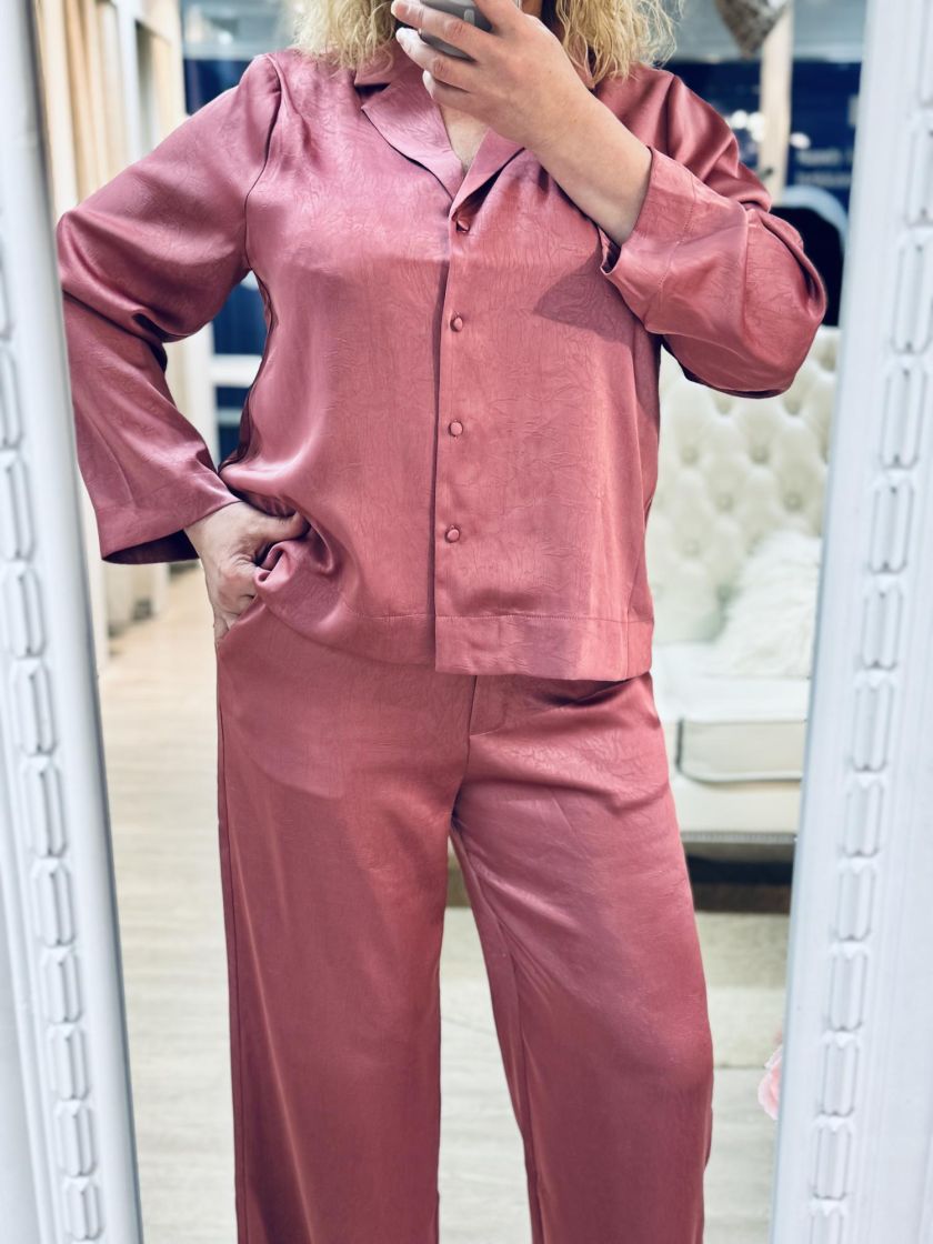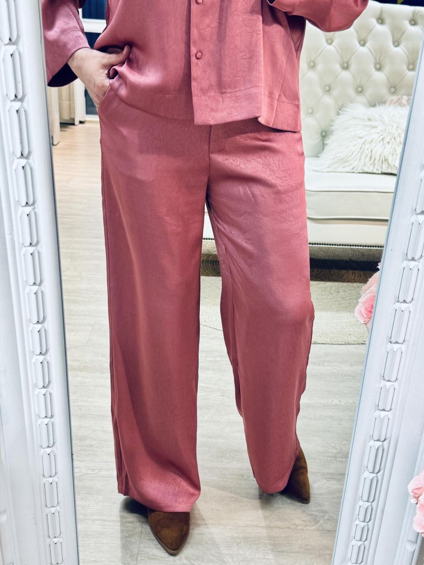 Samaa sarjaa löytyy pusero, mutta toimii mainiosti myös esimerkiksi neuleiden kanssa. A-VIEW housut kaunista, tukevaa ja hieman ryppypintaista satiinia. Housussa on korkea joustovyötärö ja reilu leveä lahje. Mallissa on viistotaskut. Tarkistathan mitat!