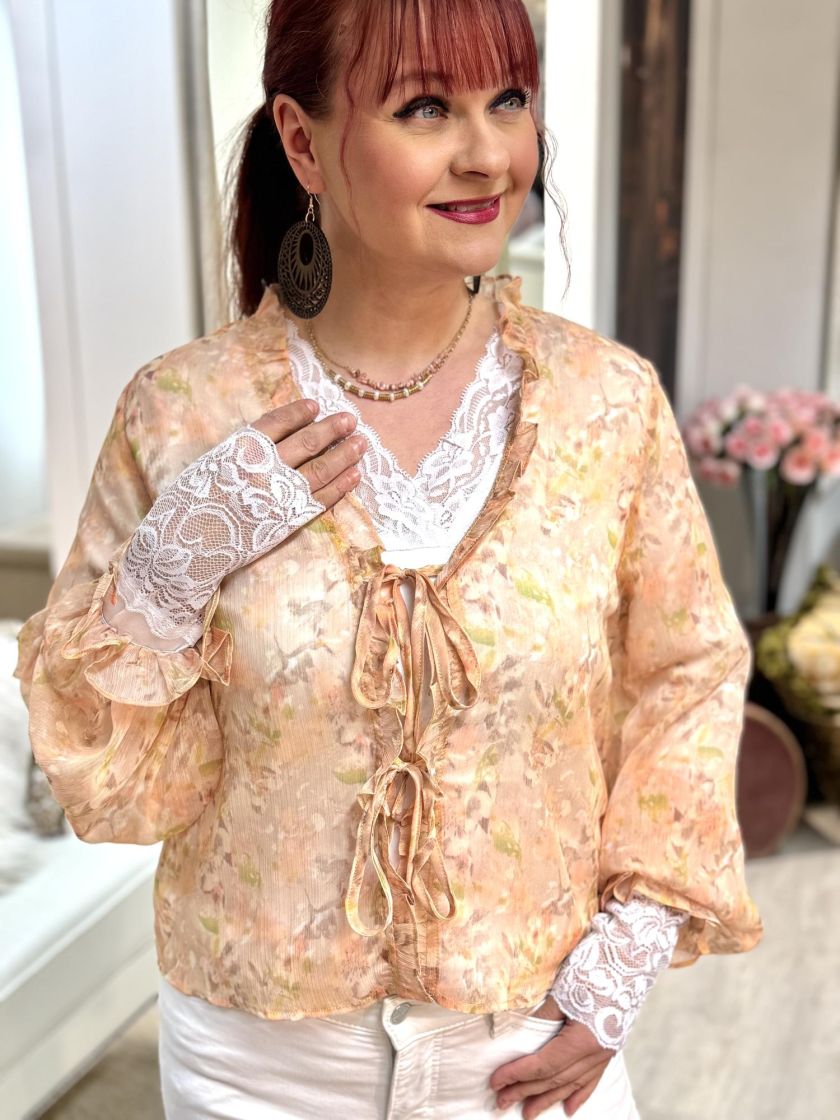 Kiva malli myös mekkojen kanssa! A-VIEW unelman kevyt frillajakku/pusero läpikuultavaa sifonkia. Pääntiellä ja edessä kiertää kapea frilla ja edessä on kahdet solmittavat nauhat. Myös hihansuussa hulmuaa frillat ja ryhtiä antaa kuminauha. Alle voi laittaa topin. Malli on siro.