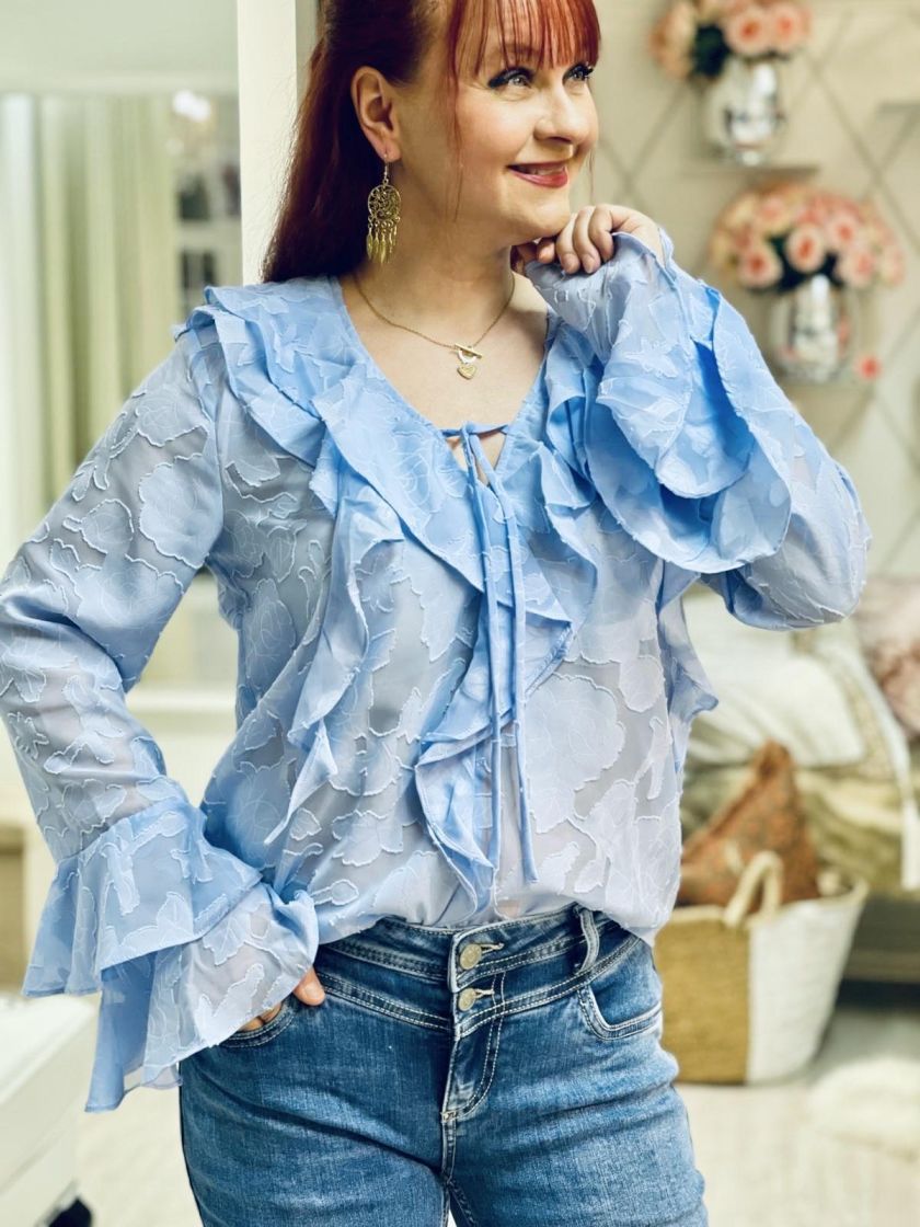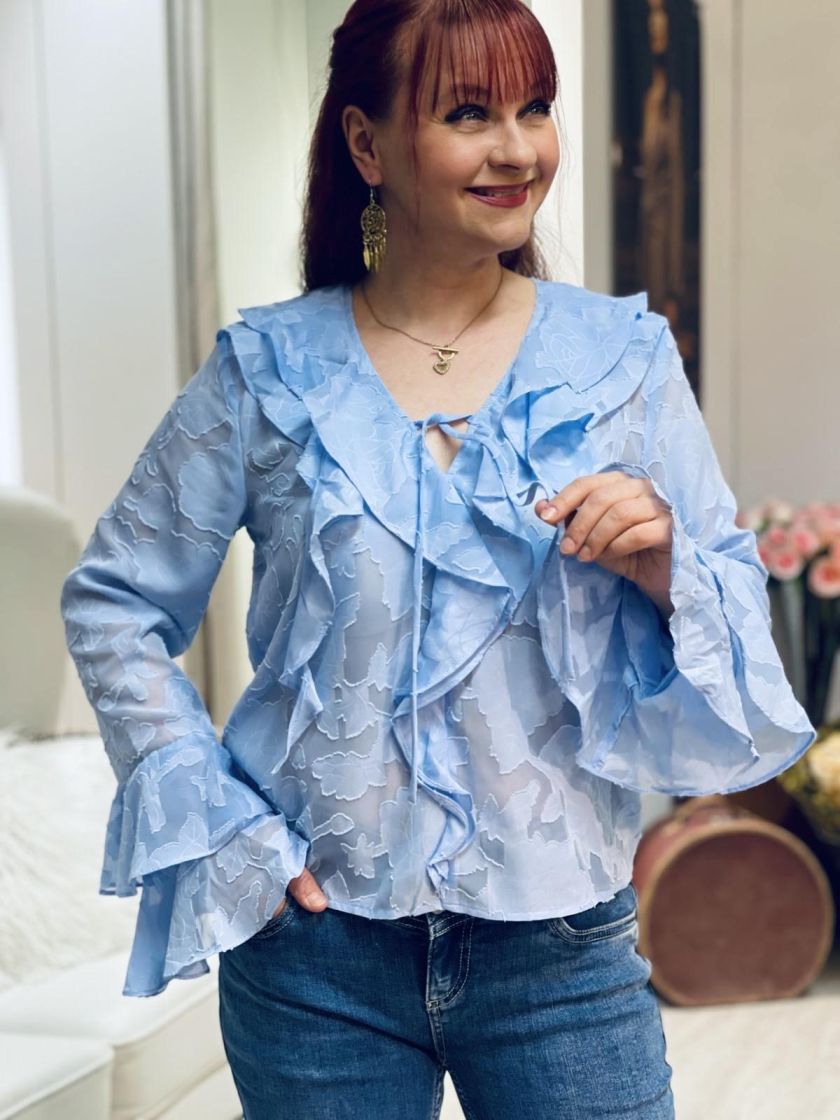 A-VIEW näyttävä frillapusero kevyttä ja osittain läpikuultavaa sifonkia. Pääntiellä ja edessä kiertää kaunis frilla ja pääntiellä on solmittavat nauhat. Myös hihansuussa hulmuaa frillat. Malli on siro.