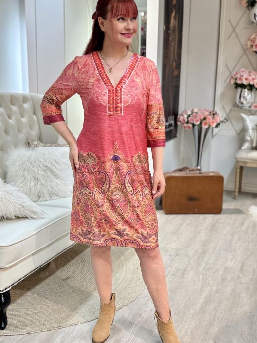 Ana Alcazar paisley kuviollinen mekko ihanan liukaspintaista ja joustavaa trikoota. Edessä pääntiellä upeat helmikoristelut. Malli on kauniin linjakas. Tarkistathan mitat.