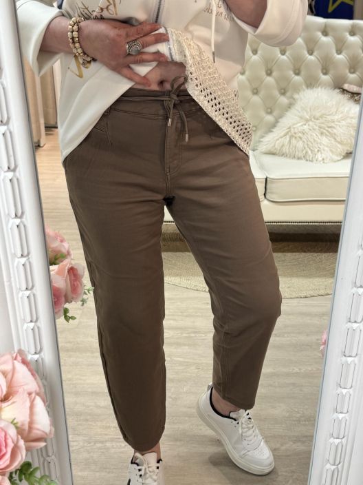 Cecil nilkkamittaiset housut pehmeän coffee taupen värissä. Materiaali ihanan pehmeää puuvillasekoitetta. Housussa on joustovyötärö kiristysnauhoilla, ja nappi vetoketjukiinnitys. Takana taskut ja edessä sivutaskut. Malli on väljä, lahensuu kapea ja vyötärönkorkeus normaali. Mitoitus reilu. S koko vastaa n.42 kokoa. Tarkistathan mitat.
