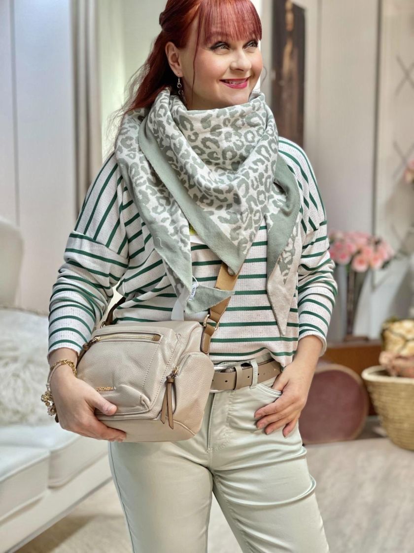 Cecil kolmiohuivi leokuosilla kahdessa värissä. Huivissa on värit toisella puolella peilikuvana, mikä antaa kivaa mukautuvuutta huiville. Materiaali on todella pehmeää ja mukavan tuntuista neulosta.