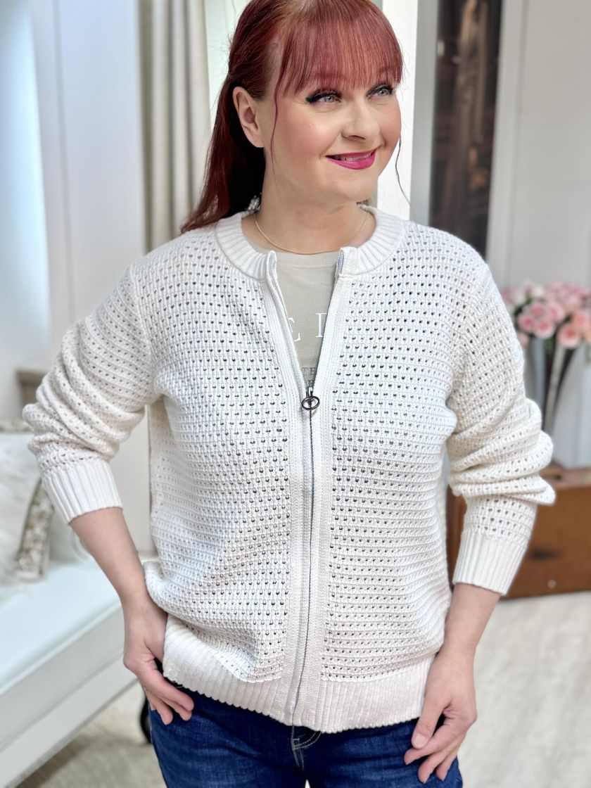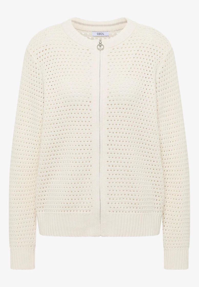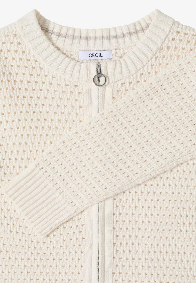 Cecil pitsineuletakki ihanan pehmeää puuvillaneulosta. Neuletakin malli on klassisen tyylikäs ja pitsineulos kivan eläväistä. Vetoketju edessä ja resorit pääntiellä, helmassa sekä hihansuussa tuo rentoa fiilistä. Mitoitus on normaali.