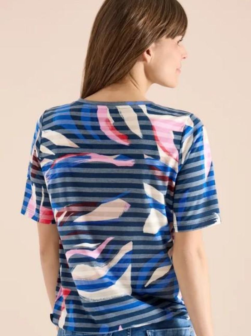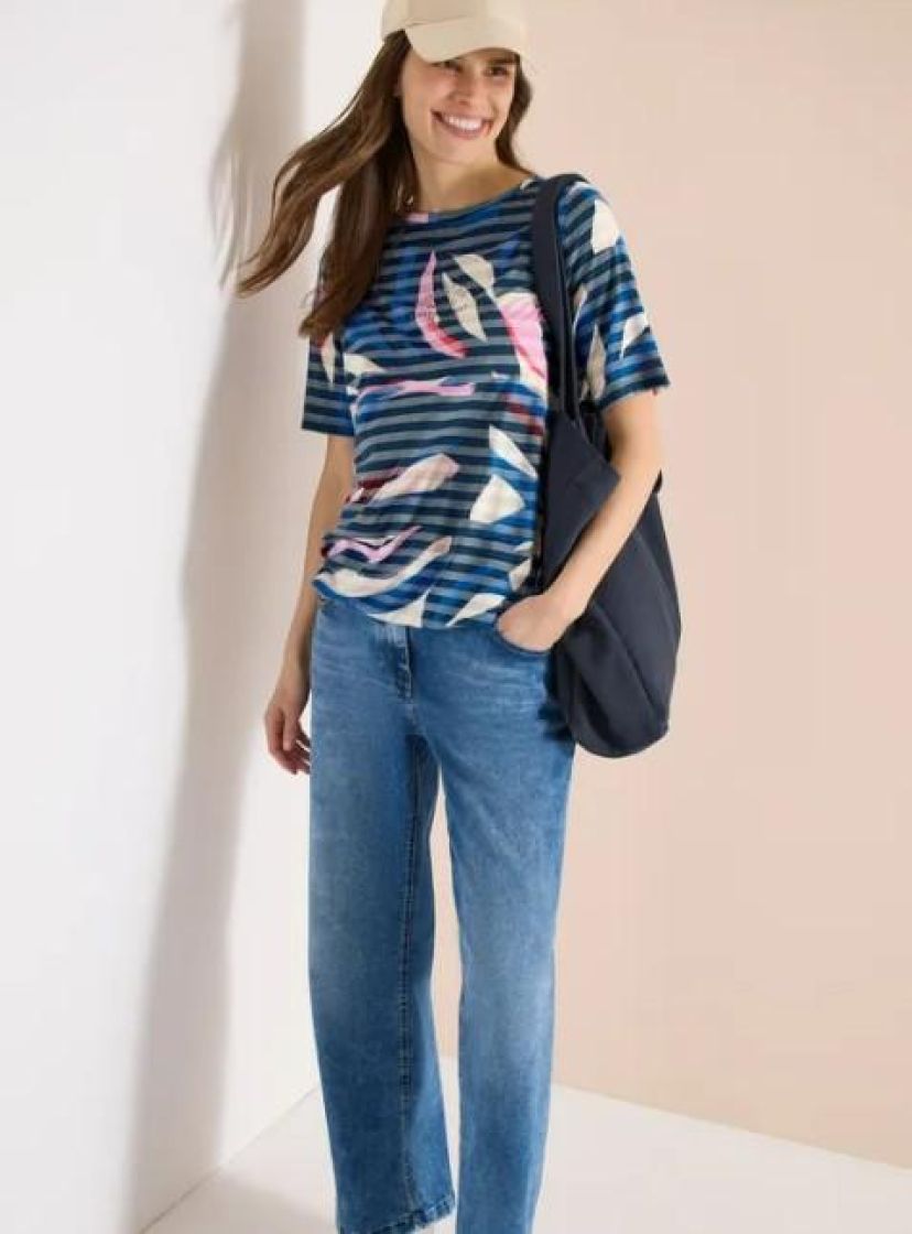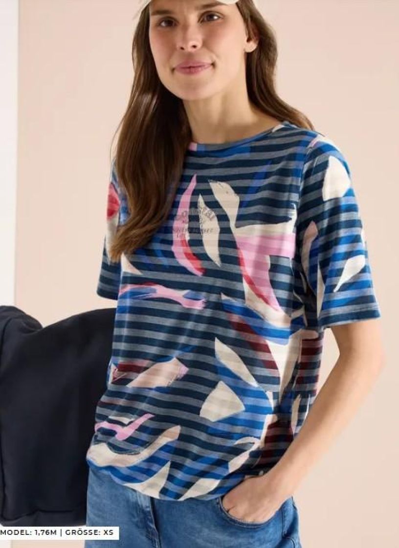 Väriä asuun pehmeällä t-paidalla! Cecil paita ohutta ja erittäin pehmeää viskoosisekoitetta. Paidassa kiva värikäs kuosi ja edessä teksti. Kivana jujuna on joustonauha helmassa, jolla voi säädellä paidan istuvuutta.