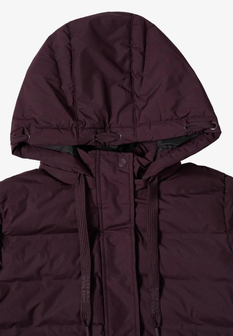 Cecil toppatakki tumman luumun värissä. Vetoketju aukeaa kätevästi kahteen suuntaan ja taskut suljetaan neppareilla. Helmaa voi keventää avaamalla vetoketjuja sivuilta. Hihansuuhun lämpöä tuo ohuet trikoiset tuulensuojat ja sisäpuolelta löytyy kätevä povitasku. Huppu on irrotettava ja siinä on kiristysnauhat. Takissa on mukana sisäpuolella kantonauhat, joilla takkia voi kantaa reppumaisesti takana sisätiloissa ollessa. Nauhat saa halutessaan pois. Tarkistathan mitat.