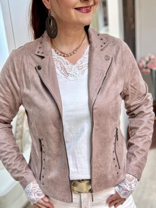 In Front jakku ihanan ohutta ja joustavaa nahkajäljitelmää. Materiaali on todella miellyttävää ja siinä on kiva elävä pinta. Jakussa on paljon kivoja yksityiskohtia, koristevetoketjut ja makeita niittejä. Jakku on kevyt ja siinä ei ole vuoria. Malli on sievä ja kauniisti istuva.