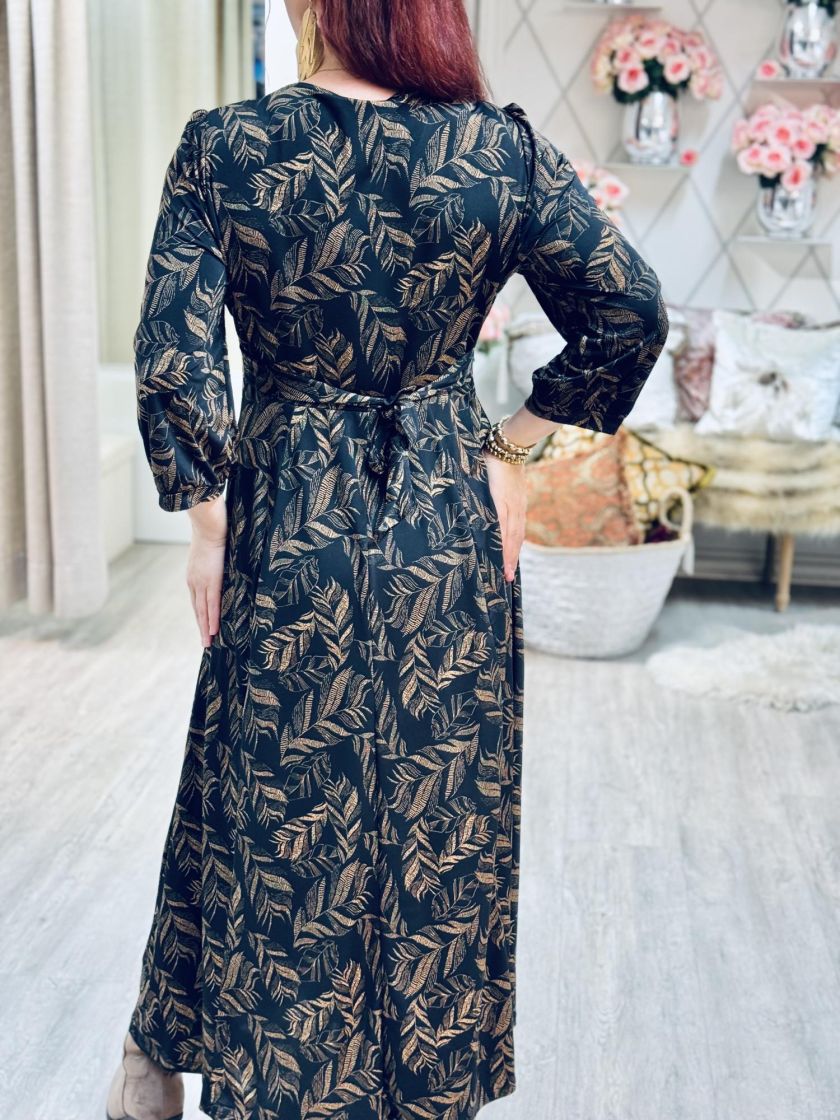 In Front mekko kauniilla sulkakuosilla. Malli on kauniisti ylhäältä istuva ja helma upeasti kellottuva. Pussihihaan ryhtiä tuo hihansuussa kaitale ja vyötäröllä taakse solmittavat kaitaleet. Nappilista edessä on kiinniommeltu. Materiaalina mukavan joustava, liukaspintainen ja ohut pese ja pidä trikoo, jossa kiva hieman kiiltävä pinta.