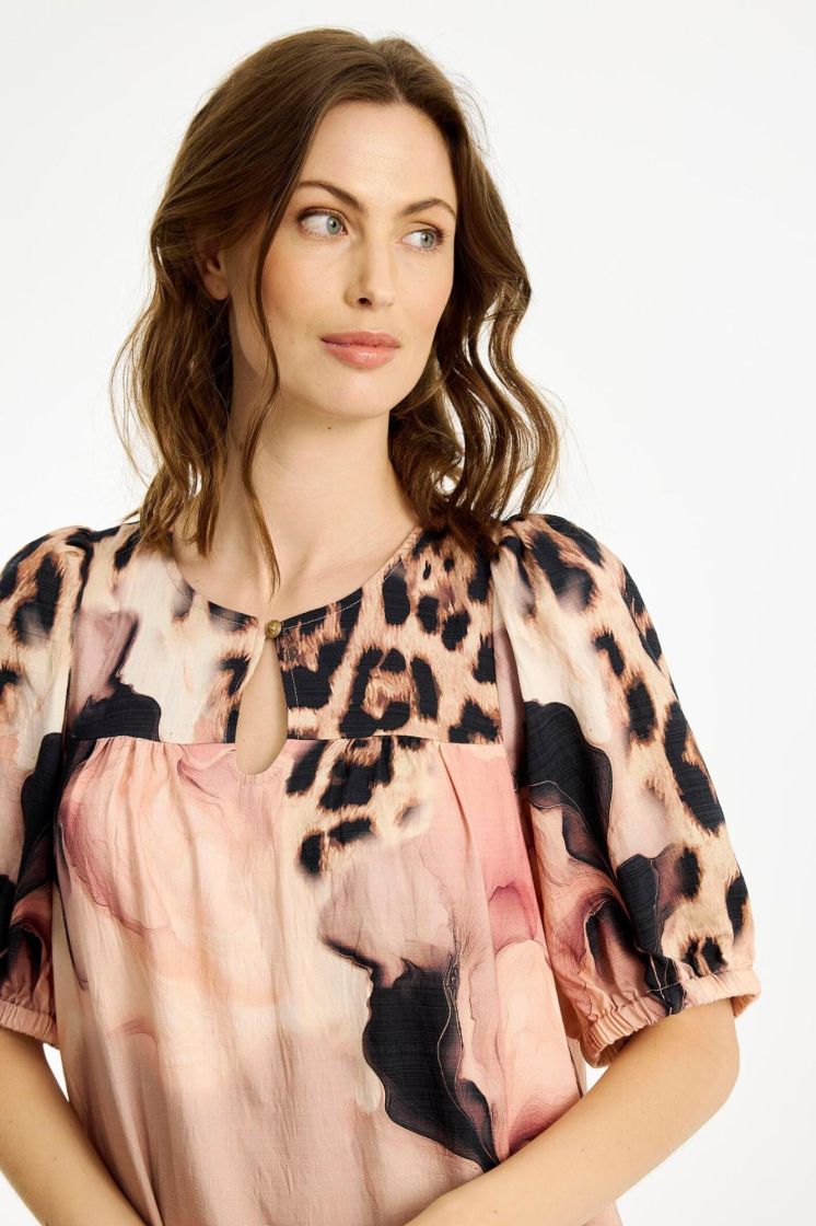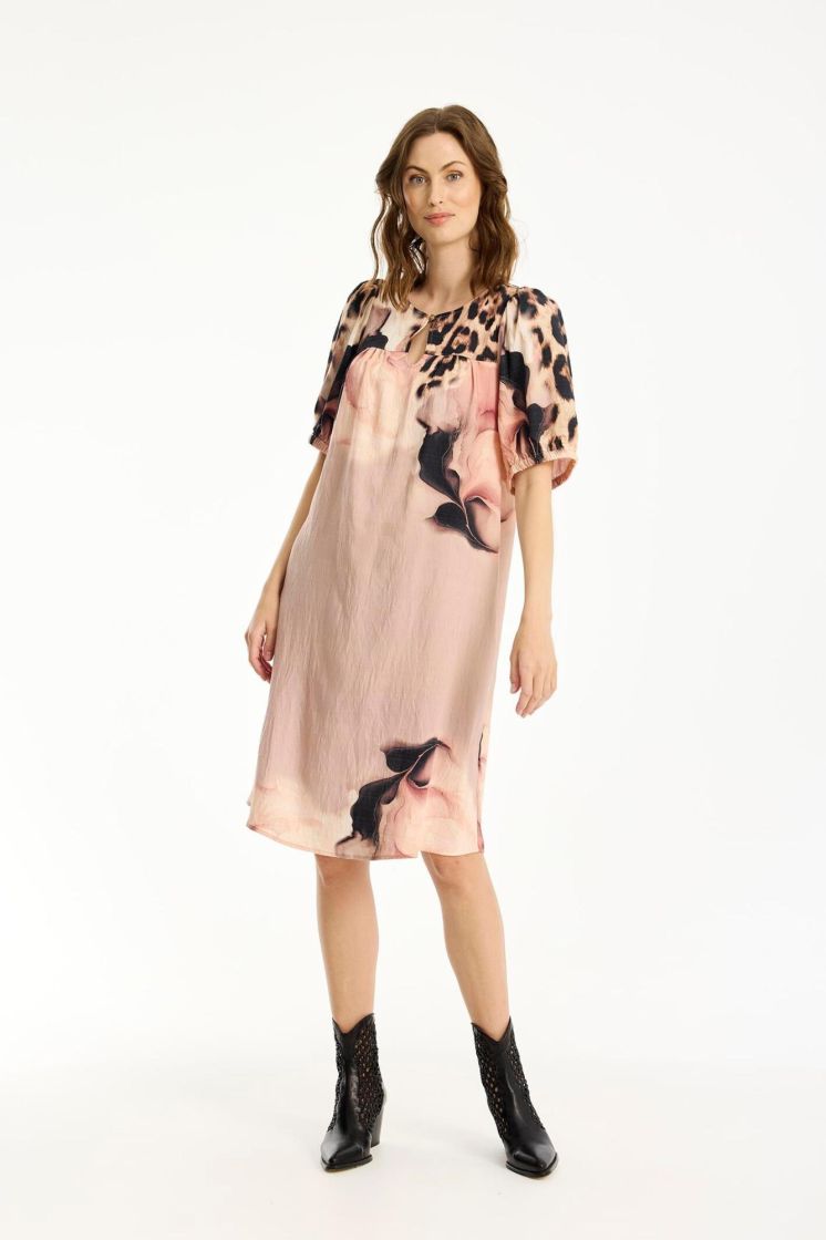 In Front mekko upealla värillä ja kuosilla yhdistäen eläinkuosia. Edessä ja takana on kaarrokkeet ja takana kaarrokkeen alla on rypytystä. Hihaan antaa ryhtiä kuminauha ja pääntiellä nappi. Materiaali on ohutta ja hieman siftaavaa viskoosisekoitetta.