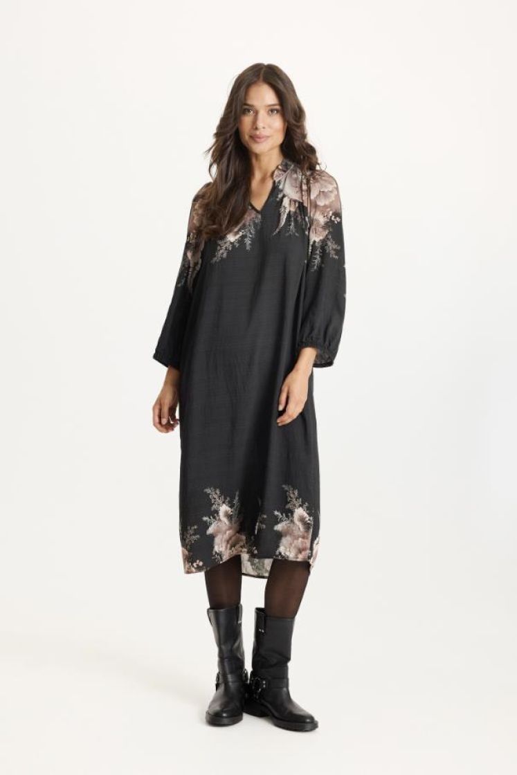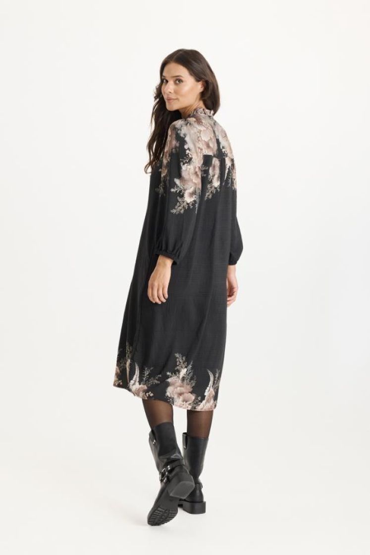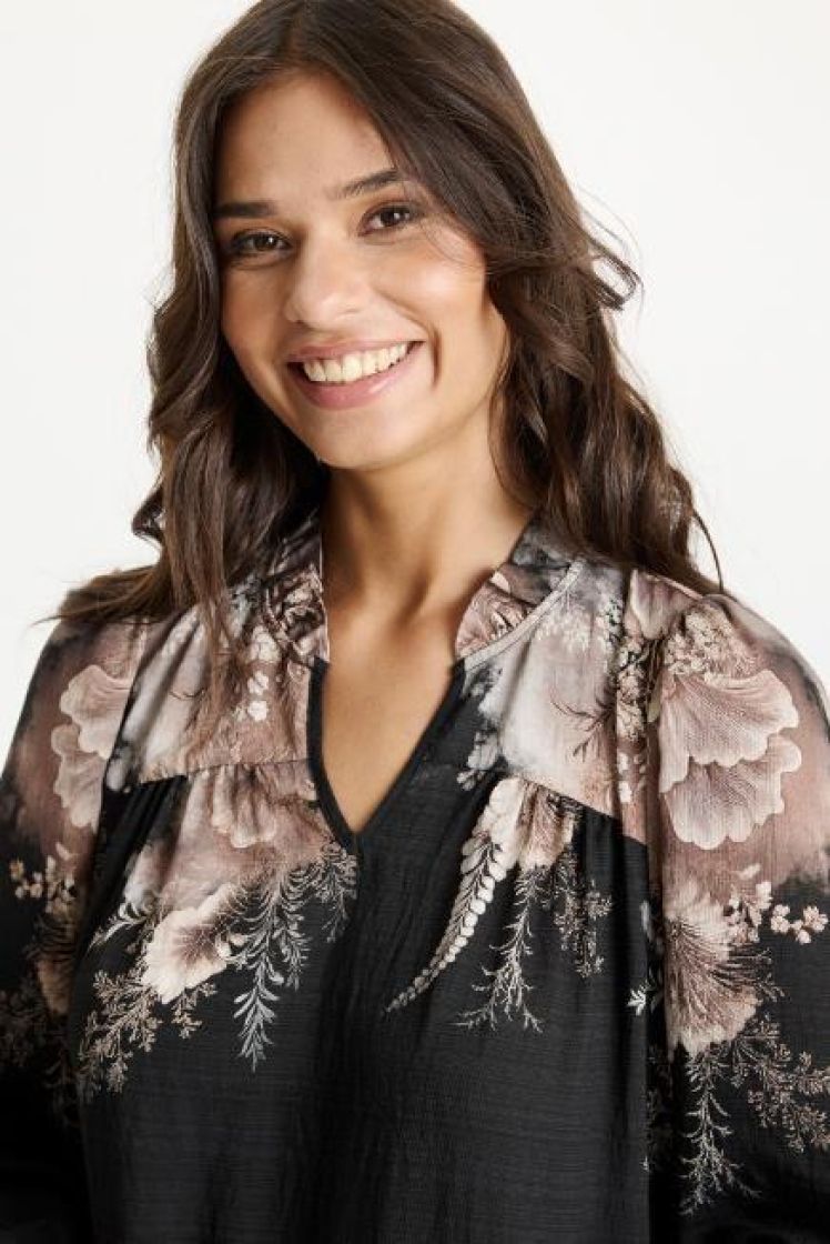In Front mekko upealla ruskealla kuosilla helmassa ja ylhäällä. Kuosin lisäksi kankaassa on kevyt vaakaraita. Edessä ja takana on kaarrokkeet ja kaarrokkeen alla on rypytystä. Hihaan antaa ryhtiä kuminauha ja pääntiellä ilmettä frillakaulus. Materiaali on ohutta ja hieman siftaavaa viskoosisekoitetta. Malli on väljä ja mitoitus reilu. Tarkistathan mitat.