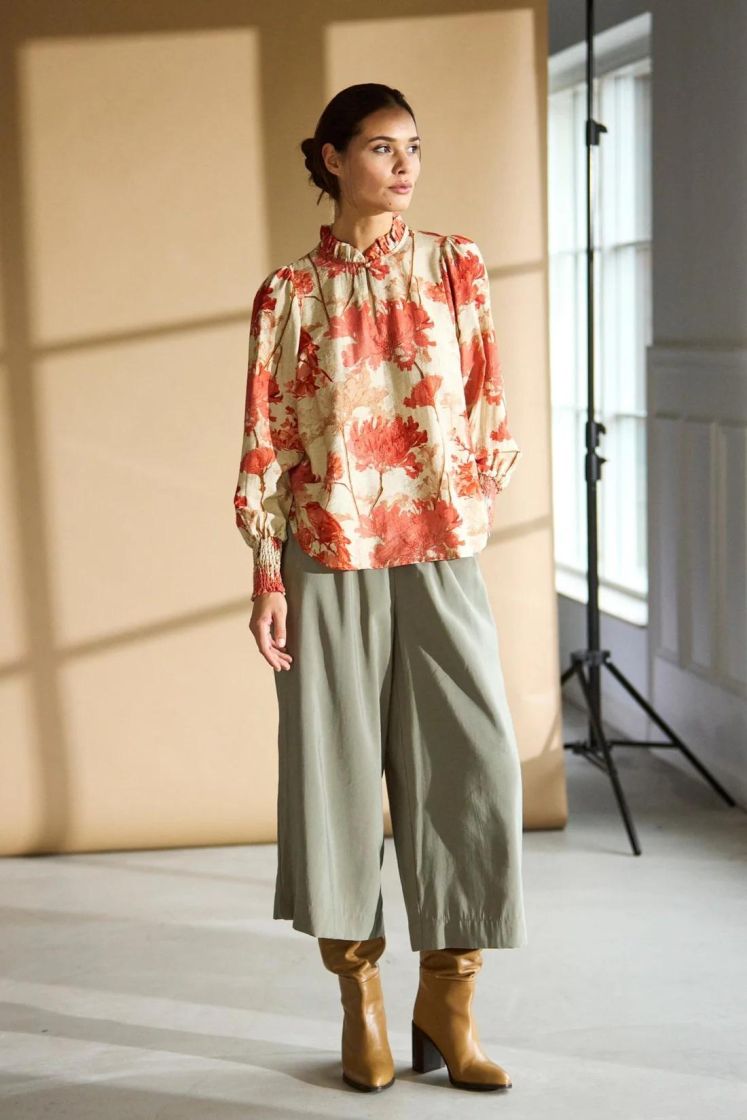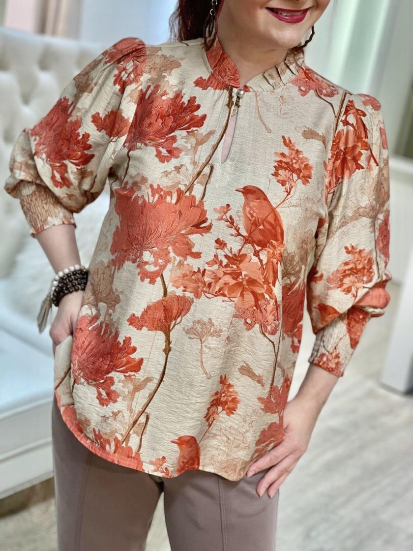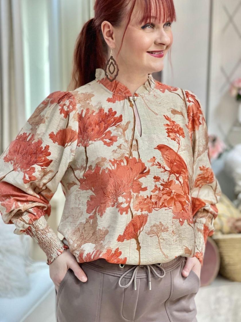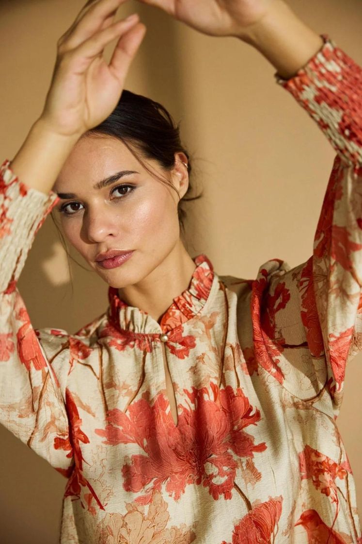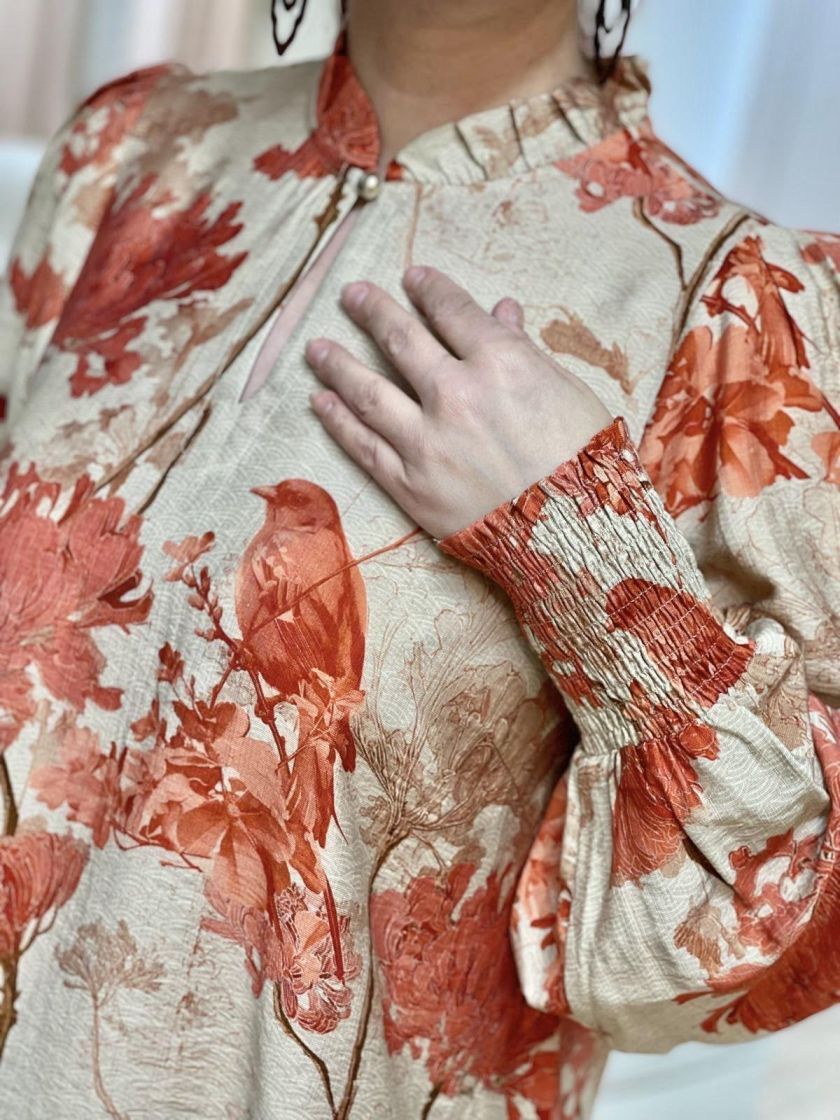 In Front pusero yhdistäen makeasti graafista kuosia, kukkia ja lintuja. Mallissa on frillakaulus, nappi pääntiellä ja helma hieman kaarrettu. Olalla on rypytystä ja hihansuussa ryhtiä tuo kuminauharesori. Materiaali on hieman siftaavaa viskoosisekoitetta.