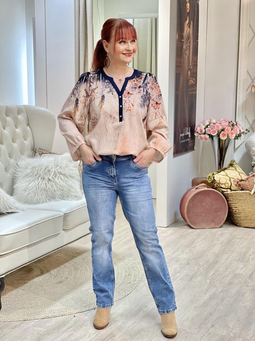 Ihana vaikka farkkujen kanssa! In Front kaunis roosa-tummansininen pusero. Edessä pääntien alla on nappeja ja hihaan antaa ryhtiä kuminauha. Helma on hieman kaarrettu ja takaa löytyy kaarroke. Materiaali on hieman siftaavaa viskoosisekoitetta.