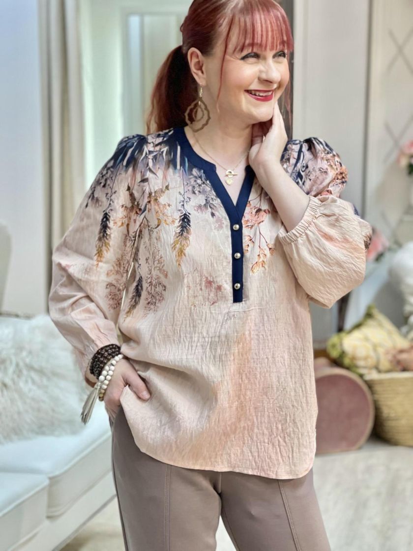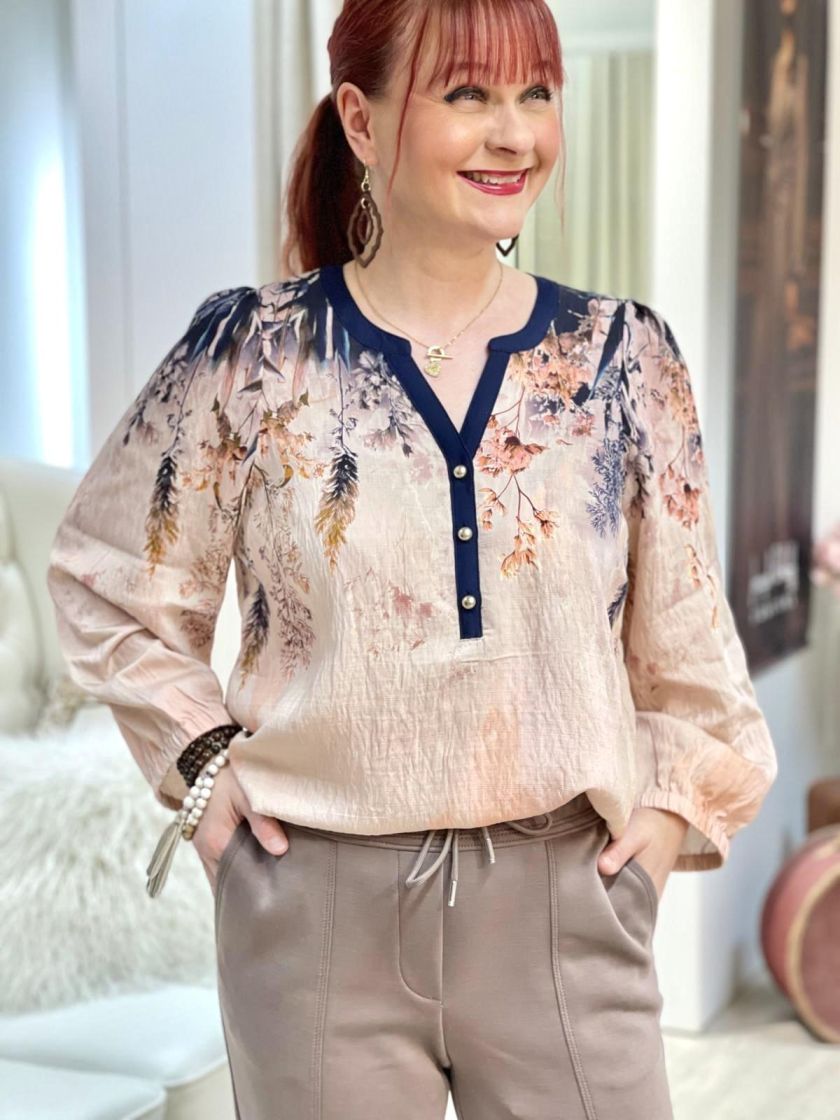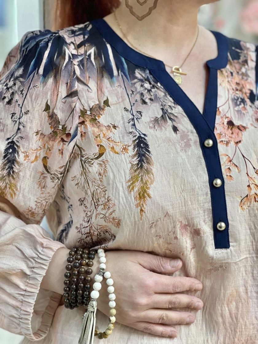 In Front kaunis roosa-tummansininen pusero. Edessä pääntien alla on nappeja ja hihaan antaa ryhtiä kuminauha. Helma on hieman kaarrettu ja takaa löytyy kaarroke. Materiaali on hieman siftaavaa viskoosisekoitetta.