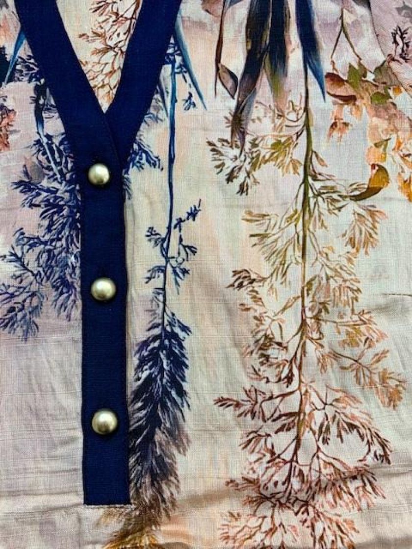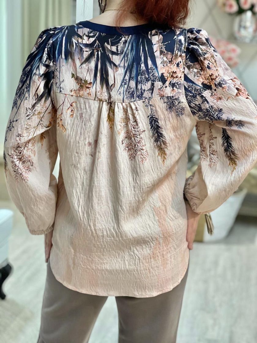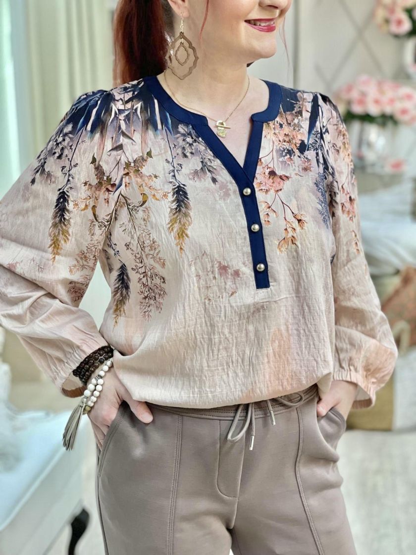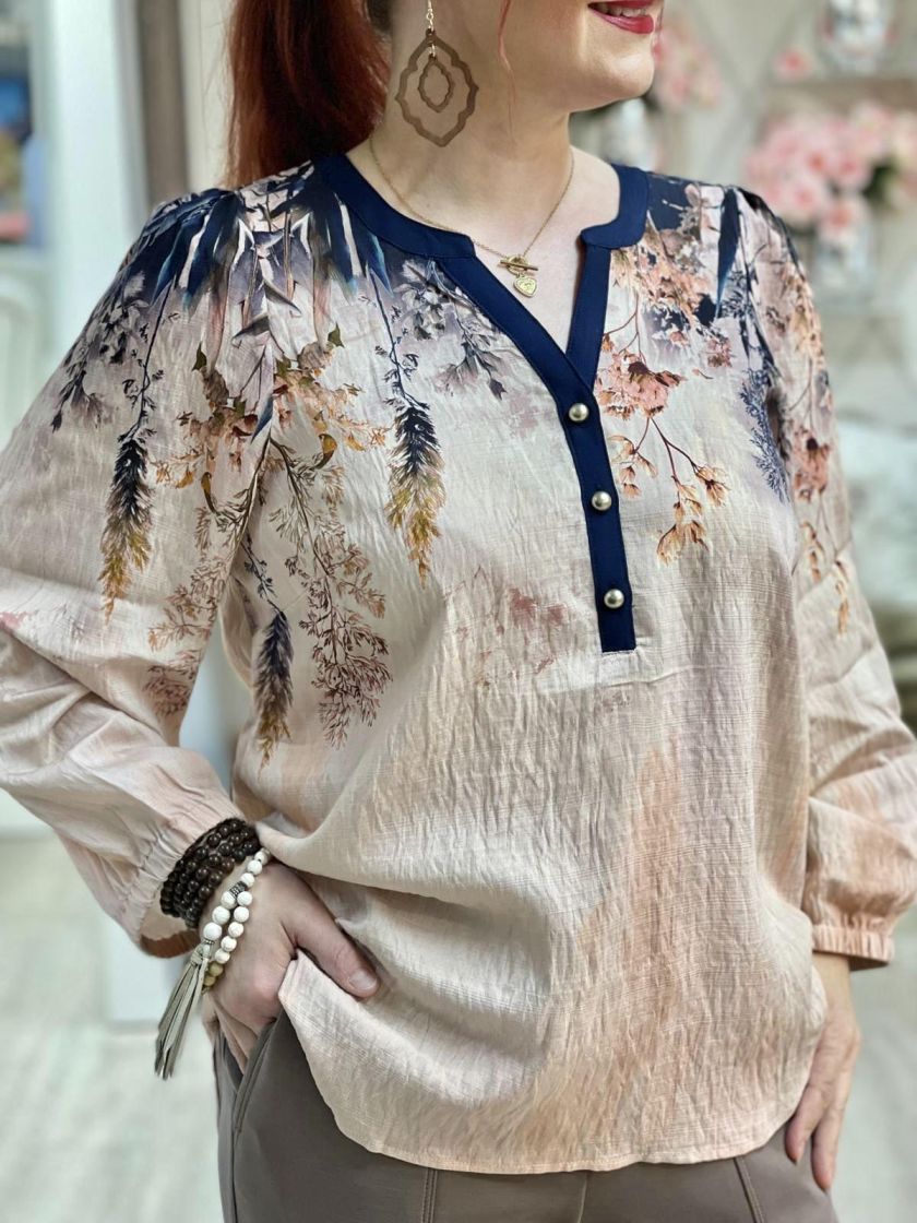 In Front kaunis roosa-tummansininen pusero. Edessä pääntien alla on nappeja ja hihaan antaa ryhtiä kuminauha. Helma on hieman kaarrettu ja takaa löytyy kaarroke. Materiaali on hieman siftaavaa viskoosisekoitetta.
