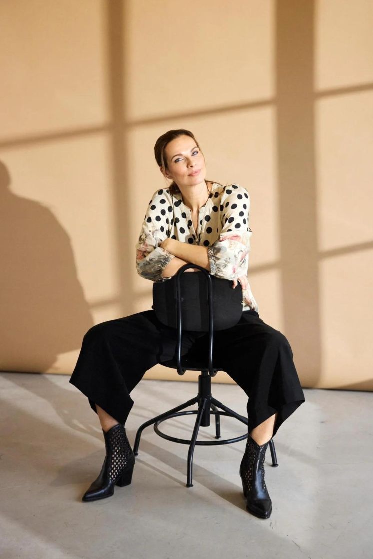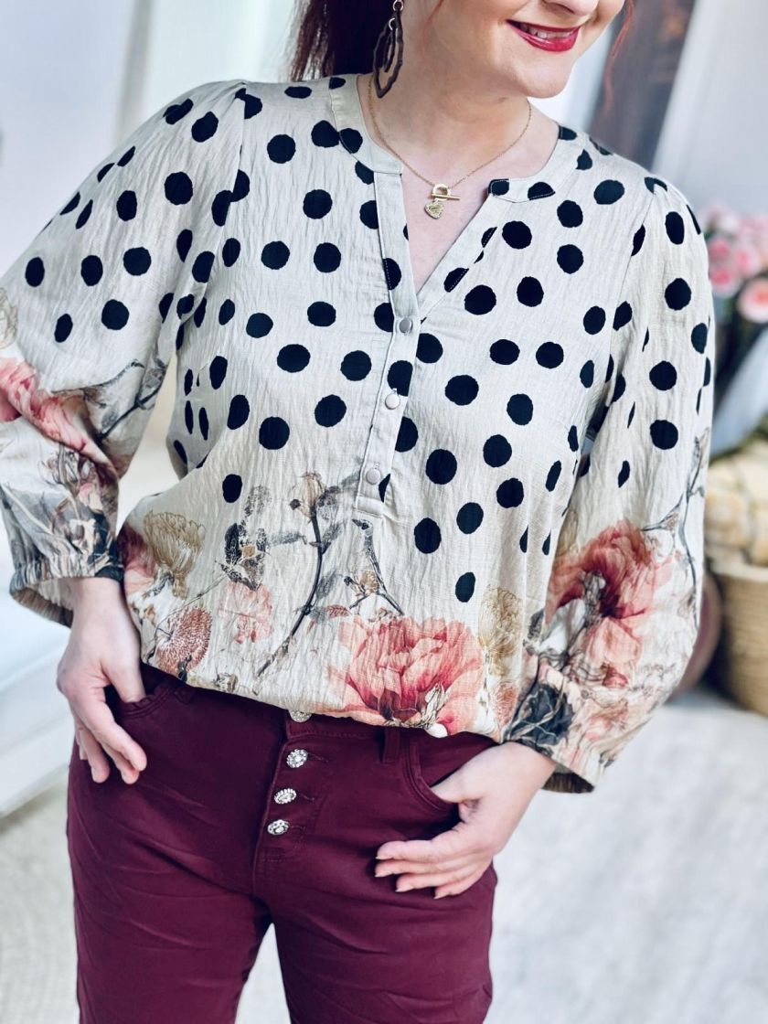 Upea kuosi! In Front pusero upealla kuosilla, jossa yhdistyy pallot, linnut ja kukat. Edessä pääntien alla on nappeja ja hihaan antaa ryhtiä kuminauha Helma hieman kaarrettu. Materiaali on hieman siftaavaa viskoosisekoitetta.