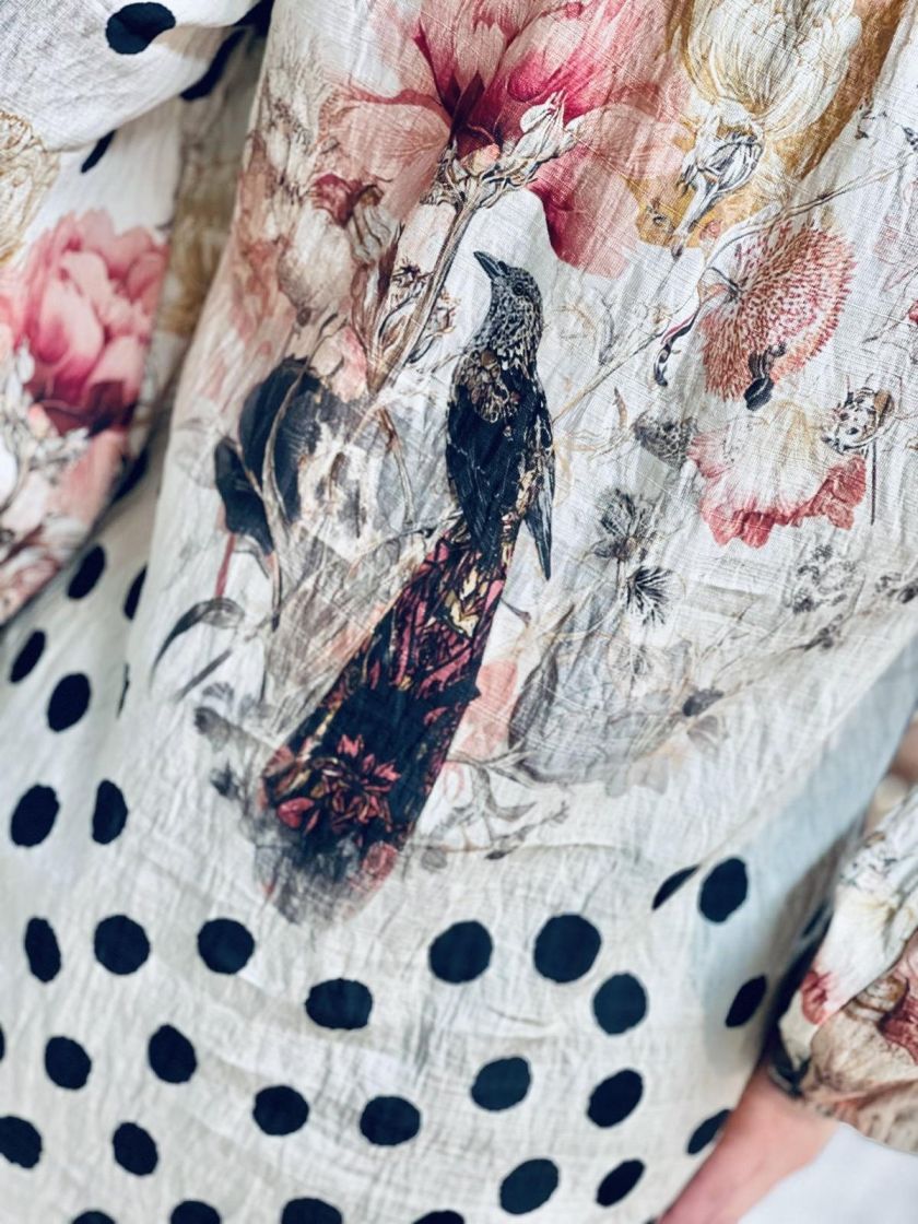 In Front pusero upealla kuosilla, jossa yhdistyy pallot, linnut ja kukat. Edessä pääntien alla on nappeja ja hihaan antaa ryhtiä kuminauha Helma hieman kaarrettu. Materiaali on hieman siftaavaa viskoosisekoitetta.