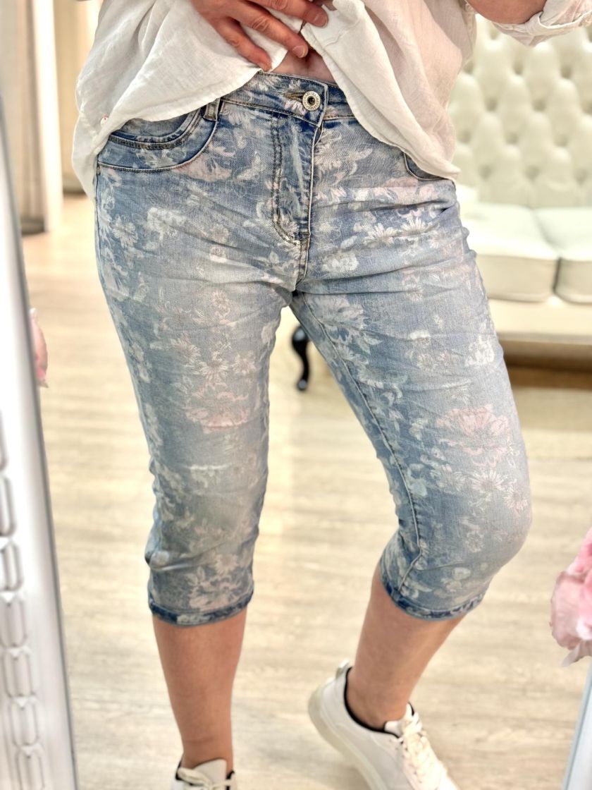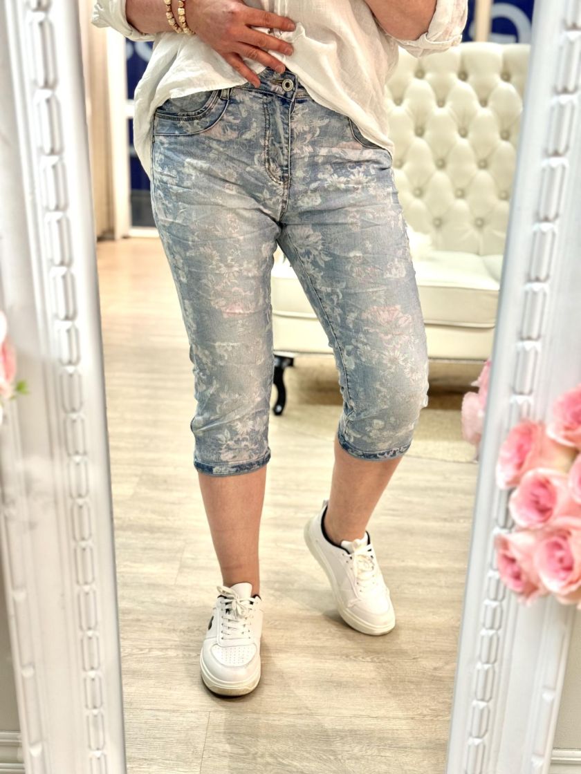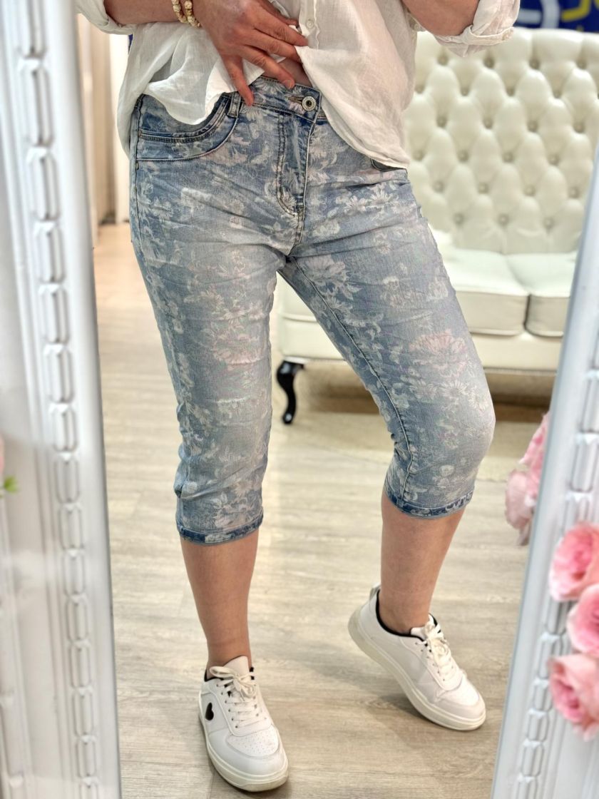 New Collection söpöt kukalliset farkkucaprit. Materiaali joustavaa ja mukavaa puuvillasekoitetta. Sivuilla ja takana taskut ja nappi, vetoketju kiinnitys. Mallissa normaali mitoitus. Tarkastathan mitat.